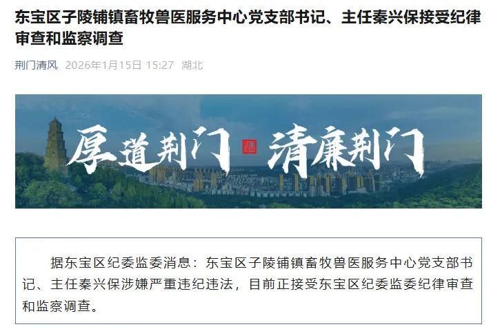 据东宝区纪委监委消息:东宝区子陵铺镇畜牧兽医服务中心党支部书记、主任秦兴保涉嫌严重违纪违法,目前正接受东宝区纪委监委纪律审查和监察调查。