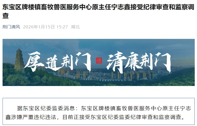 据东宝区纪委监委消息:东宝区牌楼镇畜牧兽医服务中心原主任宁志鑫涉嫌严重违纪违法,目前正接受东宝区纪委监委纪律审查和监察调查。