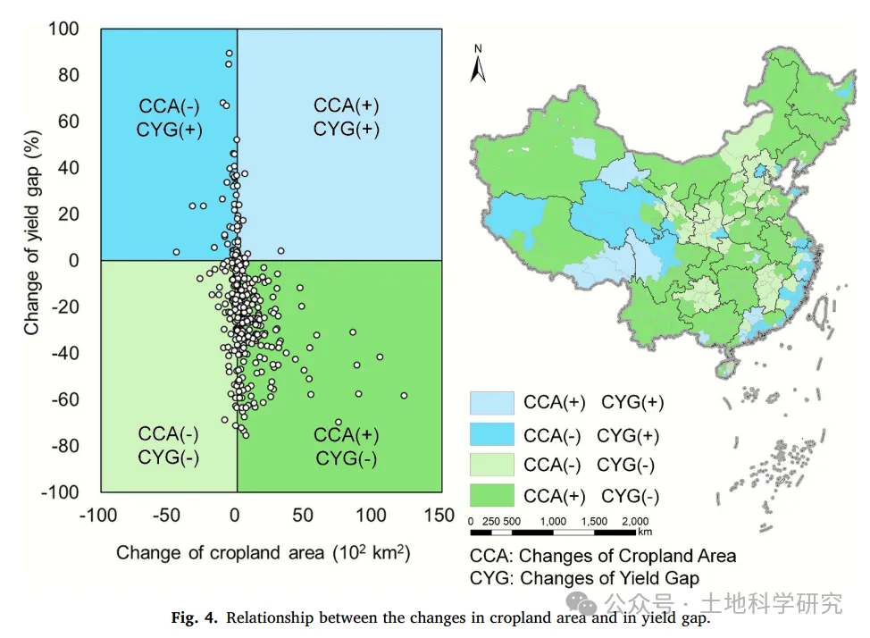 其次,我们探究了耕地面积变化与耕地利用集约化之间的相互作用。后者通过产量差距随时间缩小来衡量。这种方法具有合理性,因为尽管产量差距受品种改良和管理等多种因素影响,但在研究期间中国缩小该差距的主导路径与投入品集约化密切相关。因此,产量差距趋势可作为反映净集约化动态的综合性宏观指标。