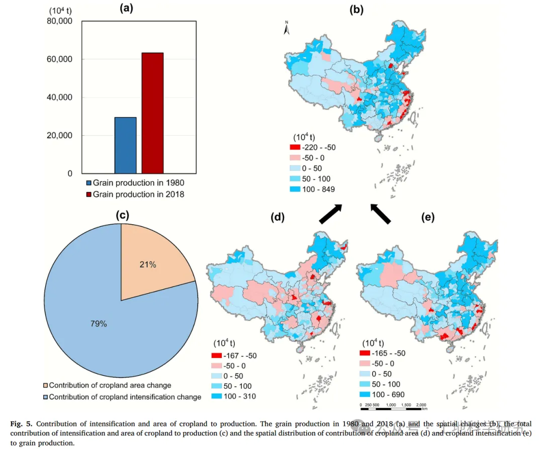 意义:本研究首次在精细空间尺度上,对中国的耕地系统动态——包括耕地集约化与面积变化——进行了长期综合分析,并考察了二者对粮食产量的协同影响。该研究不仅揭示了通过扩大耕地面积或提高耕地集约化水平均可提升粮食产量的机制,更阐明了不同地区主导增产路径的差异、作用程度及组合方式。该研究为政策制定者和利益相关方提供了关键洞见,为可持续农业实践及国家粮食安全议题的探讨作出贡献。