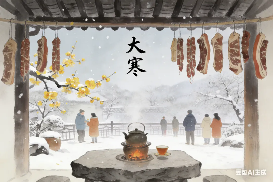 大寒通常落在公历1月20日前后,此时太阳到达黄经300°,冷空气频繁南下,气温跌至全年低谷,北方千里冰封、万里雪飘,南方也常有湿冷刺骨的“魔法攻击”。它的“冷”并非毫无章法,它是大自然的收尾与沉淀——土地在严寒中休养生息,草木在蛰伏中积蓄力量,万物都在等待一个破土而出的契机。值得一提的是,大寒与小寒虽同为“寒”,却各有侧重。小寒是“初寒”,寒气渐生;大寒是“极寒”,寒气达到顶峰,随后便会缓缓消退,向着立春过渡。正如古人所说“大寒已过,春归有期”,这凛冬的尽头,正是春日的开端。大寒恰逢年关将至,习俗多与“辞旧迎新”“御寒养生”相关,每一项都透着满满的生活暖意。