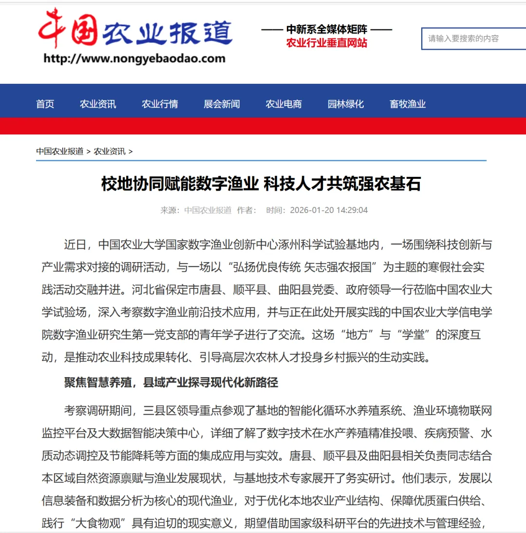 本报讯(实习生 徐思雨) 近日,中国农业大学国家数字渔业创新中心涿州科学试验基地内,一场围绕科技创新与产业需求对接的调研活动,与一场以“弘扬优良传统 矢志强农报国”为主题的寒假社会实践活动交融并进。河北省保定市唐县、顺平县、曲阳县党委、政府领导一行莅临中国农业大学试验场,深入考察数字渔业前沿技术应用,并与正在此处开展实践的中国农业大学信电学院数字渔业研究生第一党支部的青年学子进行了交流。这场“地方”与“学堂”的深度互动,是推动农业科技成果转化、引导高层次农林人才投身乡村振兴的生动实践。