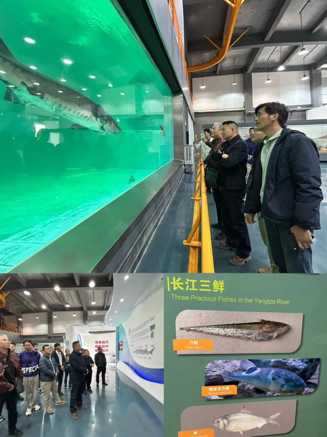在两大养殖基地,调研团实地观摩了标准化工厂化养殖车间的智能管控流程,学习循环水养殖系统、尾水三级净化工艺的实操应用,同时了解“渔光互补”模式下生态效益与经济效益双赢的运营经验。在中华鲟自然保护馆,调研团深入研习珍稀水生生物救护繁育与栖息地修复技术,明晰渔业发展与生态保护协同推进的重要性。