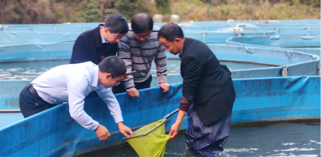 会后,项目组赴相关合作企业开展实地调研与指导,通过现场查看、数据核验、交流座谈等方式,重点考察了光唇鱼亲本培育、杂交鱼生长表现、陆基圆桶高效养殖等关键环节的实施成效,推动研究成果加快落地转化。