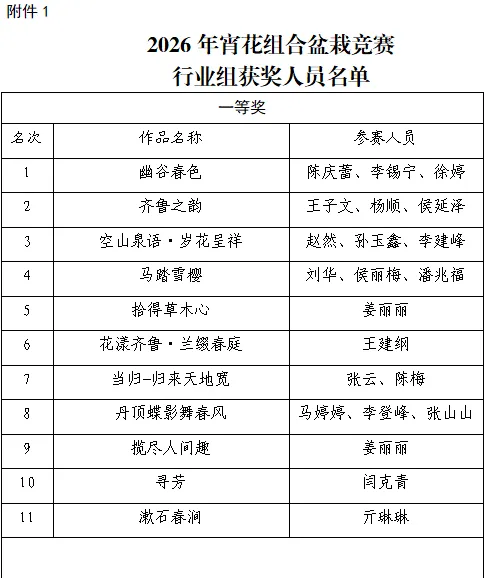 注:完整拟获奖名单详见附件1《2026年宵花组合盆栽竞赛行业组拟获奖名单》;