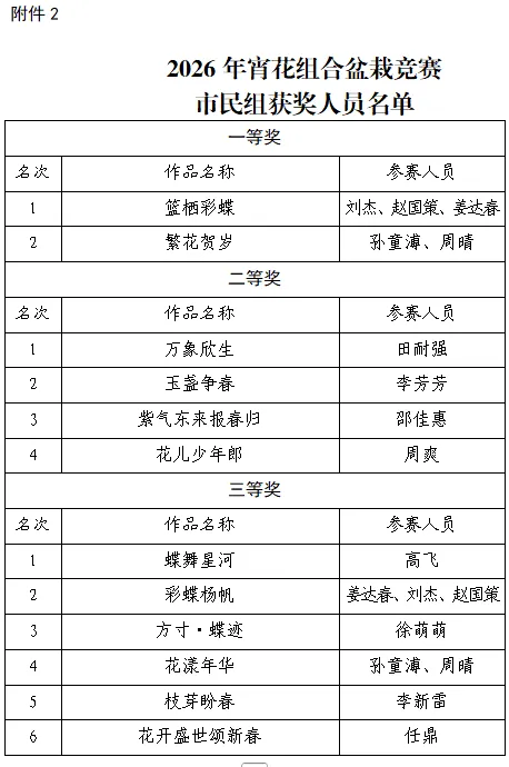 附件2《2026年宵花组合盆栽竞赛市民组拟获奖名单》。