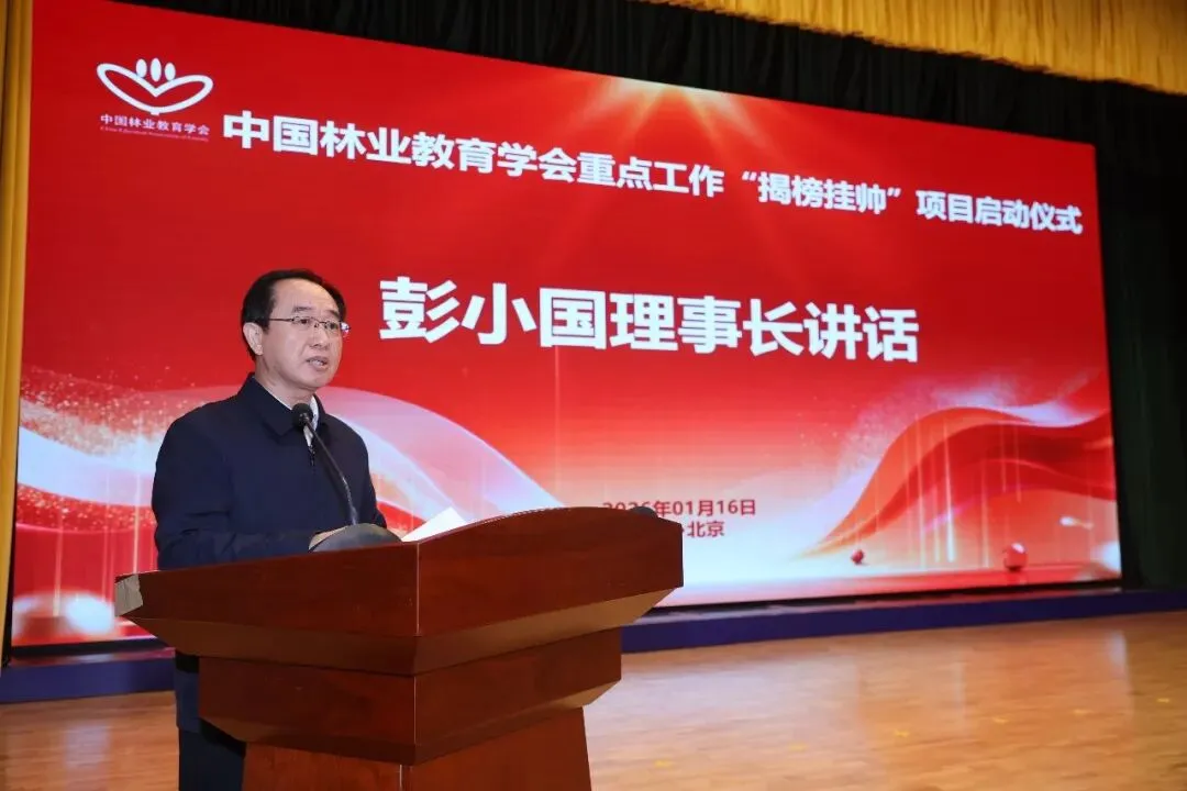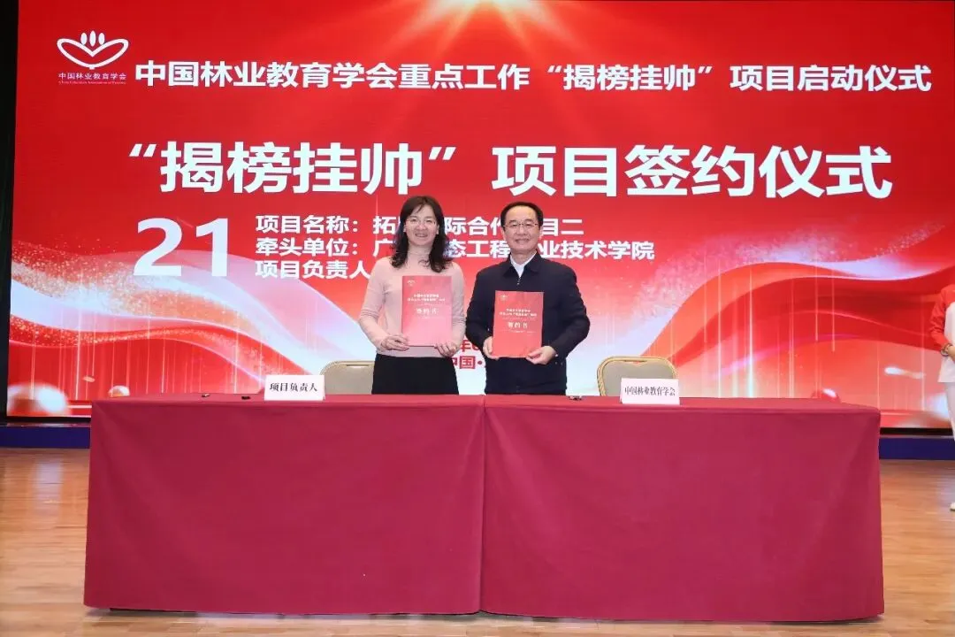 启动仪式现场,学会宣读了《关于设立中国林业教育学会“揭榜挂帅”重点项目的通知》及立项项目清单,并举行了项目签约仪式。韦林与学会理事长彭小国正式签约,承接“拓展国际合作项目”重点项目。彭小国在重点工作“揭榜挂帅”启动仪式讲话中指出,实施“揭榜挂帅”机制,是学会着眼林草教育领域科学回答好如何为党育人、为国育才时代课题,具体落实好教育强国建设规划纲要重点任务,主动适应林草事业高质量发展新要求、创新行业协同模式的一项重大举措。为林业教育服务国家战略提供有力支撑。学会重点任务在林草教育领域落地见效,优化和丰富林草教育落实教育强国战略的路径选择。