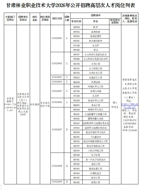 2.报名方式:应聘人员填写《甘肃林业职业技术大学公开招聘高层次人才报名表》后,连同个人相关应聘材料发送至361520231@qq.com。邮件标题注明:应聘专业名称+毕业院校+本人姓名+本人联系电话。
