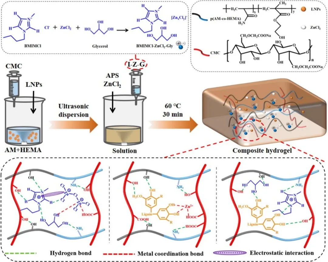 首先,研究者使用BMIMCl与ZnCl2反应得到[BMIM][ZnxCly]。随后加入甘油,构建[BMIM]+[ZnxCly]−-Gly (IZG)杂化液体,该体系通过金属配位阴离子、咪唑阳离子与甘油的分子内/间相互作用自组装为超分子结构。将此超分子液体引入P(AM-co-HEMA)水凝胶中以提升性能,并通过羧甲基纤维素(CMC)构建互穿聚合物网络进一步增强结构。同时,木质素纳米粒子与Zn2+及过硫酸铵发生动态氧化还原反应,产生大量半醌与羟基自由基,显著加速水凝胶形成并缩短凝胶时间。所得复合水凝胶命名为P-IZG/CMC,其形成机理如图1所示。图2a展示了水凝胶的制备过程。