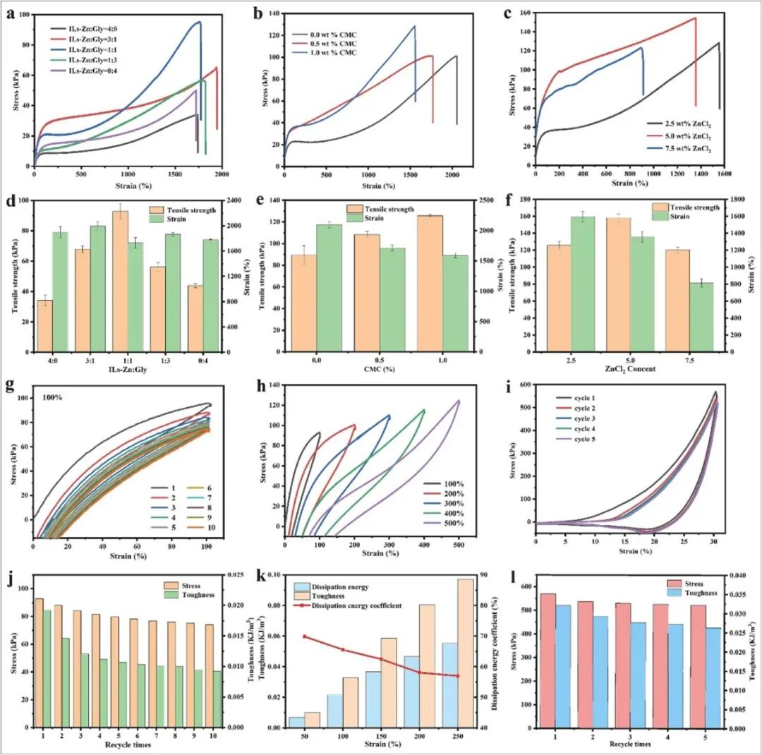 随后,系统考察了CMC含量与ZnCl2浓度对P-IZG/CMC水凝胶力学性能的影响。结果表明,CMC最佳添加量为1wt%,过量会导致凝胶不均并降低强度,其增强机制主要源于互穿网络的形成及氢键/金属配位键的增强。ZnCl2溶液的最佳浓度为5%,此时拉伸性能最优,电导率达1.56 S/m,源于适度的Zn2+配位提高了交联密度,但浓度过高会限制分子链运动而损害性能。循环拉伸压缩测试表明,该水凝胶具有优异的抗疲劳性与压缩回弹性。