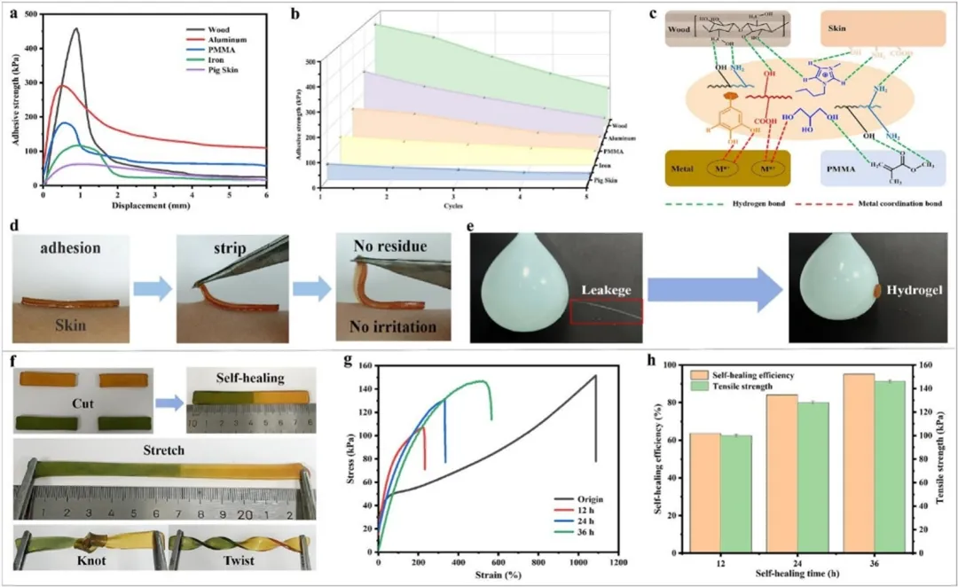 最后,研究者系统评估了P-IZG/CMC水凝胶的粘附与自修复性能。粘附测试显示,其对木材、铝、PMMA、铁及猪皮等多种基材均具有强粘附力(最高达462.3 kPa),这主要得益于共聚物链与基材表面间形成的氢键和金属-配体键。水凝胶能在人体皮肤上安全、可重复地粘附与剥离,并成功演示了封堵气球破孔的即时密封能力,体现了其良好的实用性。同时,水凝胶展现出优异的自修复能力,切断的样本在室温下重新接触后能自主愈合,36小时后拉伸强度恢复率超过95%。这些性能使其在需要可靠贴合与长期耐用性的柔性电子器件中具有重要应用潜力。