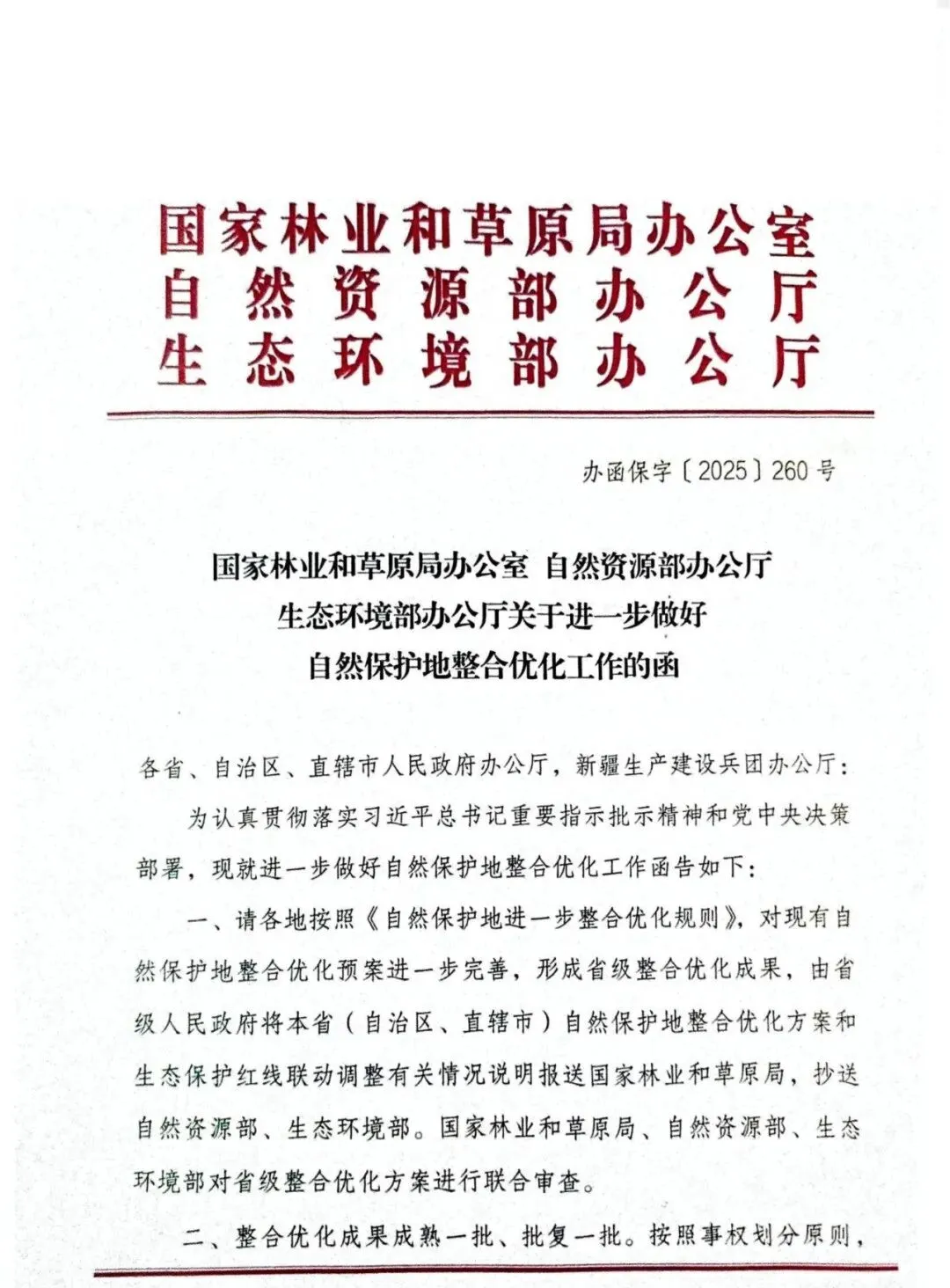 >关注--国家林业和草原局办公室 自然资源部办公厅 生态环境部办公厅关于进一步做好自然保护地整合优化工作的函(260号文)