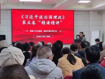 大会伊始,学校马克思主义学院陈明辉教授应邀作《习近平谈治国理政》第五卷专题辅导报告。他以深厚的理论功底和通俗易懂的语言,深入解读新时代治国理政的核心要义与思想精髓,引导老党员们在学深悟透中坚定理想信念。这场思想的盛宴,既提升了理论素养,也彰显了离退休党组织在思想政治引领上的持续发力与不懈追求。