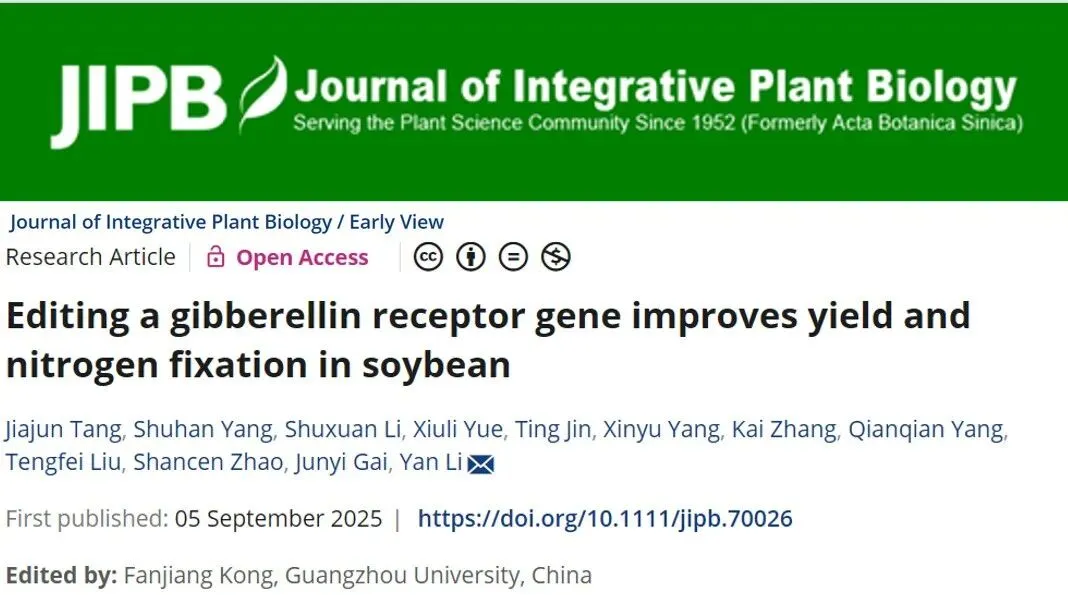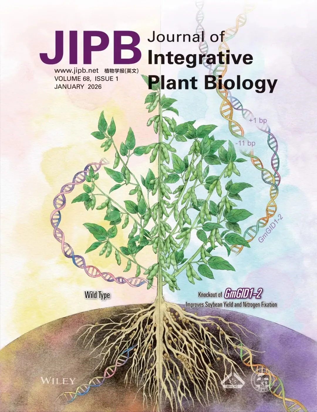 近日, JIPB在线发表了南京农业大学李艳教授团队题为"Editing a gibberellin receptor gene improves yield and nitrogen fixation in soybean" (https://doi.org/10.1111/jipb.70026) 的研究论文。该研究通过基因编辑技术敲除大豆赤霉素受体基因GmGID1-2, 实现对株型、产量、种子含油量以及根瘤固氮能力等多个性状的综合改良。创制的GmGID1-2新等位变异优于大豆种质资源中的自然等位基因, 为培育高产、高油、高固氮大豆品种提供了宝贵的遗传资源。