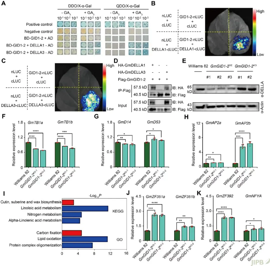 进一步研究表明, GmGID1-2与DELLA蛋白互作调控大豆株高, 并通过影响与分枝、固碳作用和脂肪酸代谢等相关的通路及基因表达 (图2), 进而调控大豆分枝数和种子含油量。