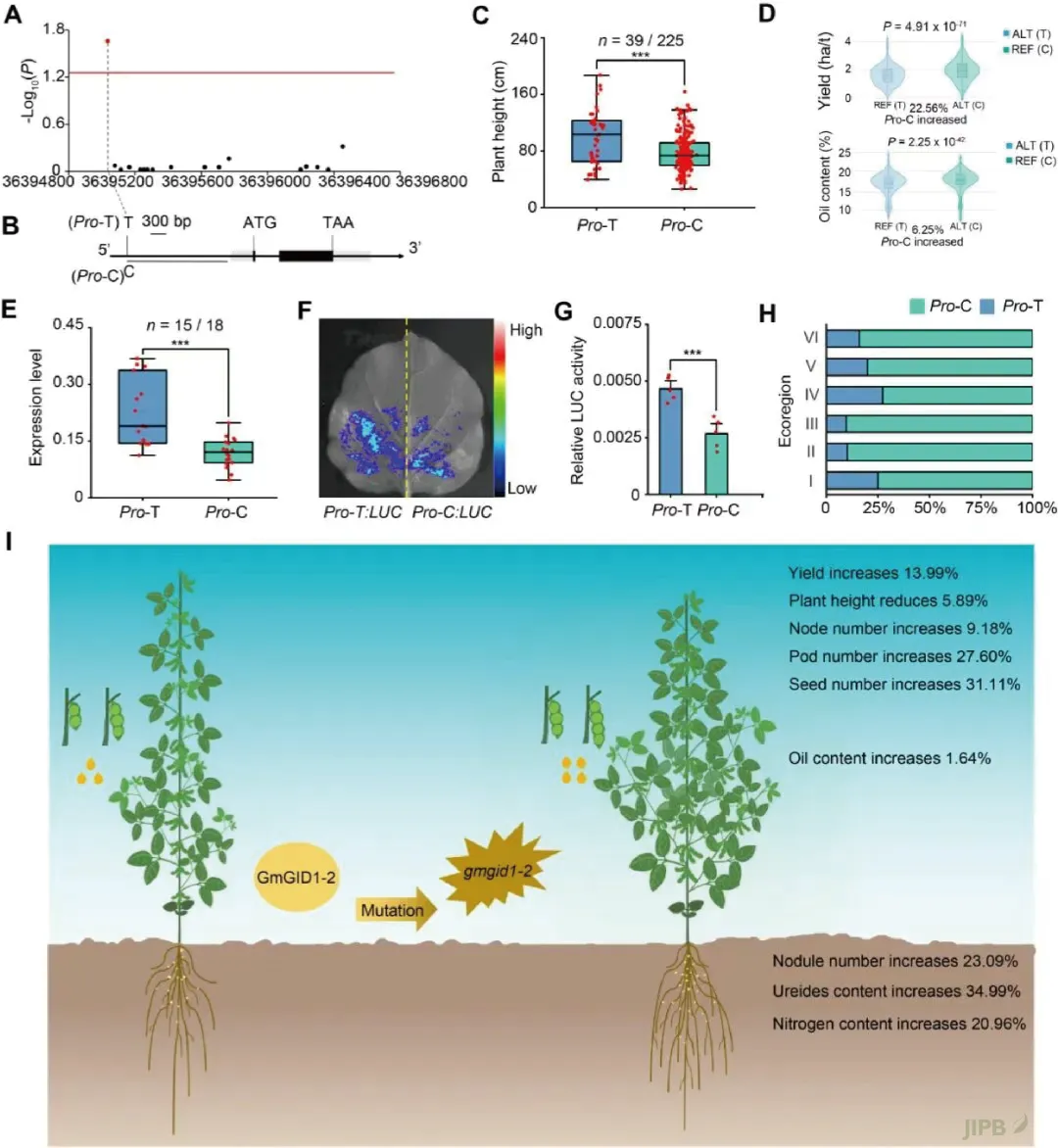 进一步分析GmGID1-2的自然变异发现 (图4), 在课题组264份大豆资源及大豆公共数据库中, 其编码区均未鉴定到导致基因功能丧失或氨基酸变化的序列变异; 而启动子区局部关联分析发现, Gm_36396036位点与大豆株高显著关联。该位点将GmGID1-2启动子分为Pro-C和Pro-T两种类型, 其中, Pro-C型启动子的大豆株高更矮、产量和种子含油量更高, 且GmGID1-2基因表达量更低,与GmGID1-2敲除株系表型一致。在Pro-C优异单倍型的遗传背景下敲除GmGID1-2, 可进一步提高大豆的产量、种子含油量和根瘤固氮。
