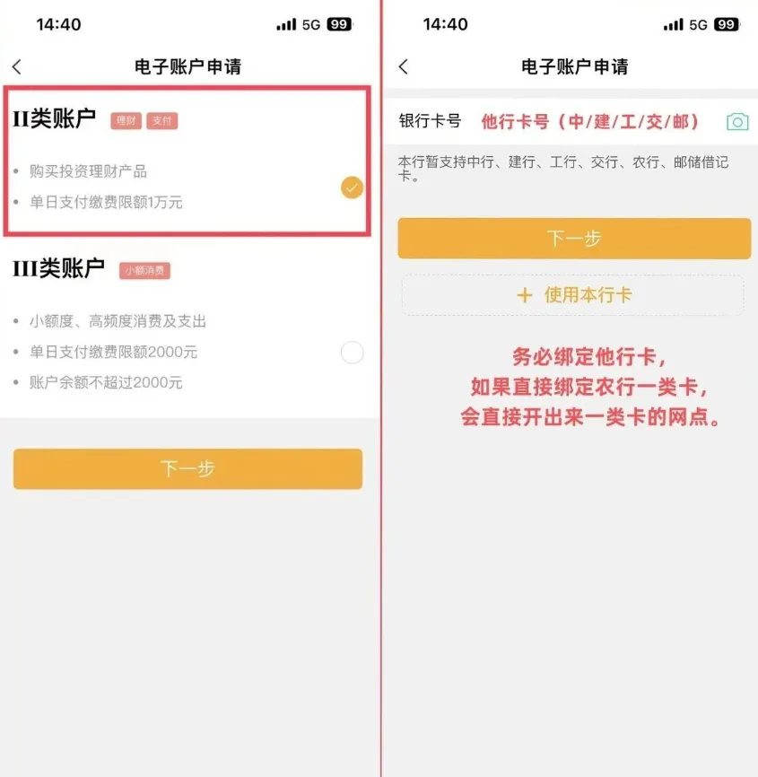 4. 绑定银行卡:必须选择他行卡(中行、建行、工行、交行、邮储) , 若直接绑定农行一类卡,将默认开通一类卡所属网点的账户,并非二类电子账户。第二步:完善信息并设置密码