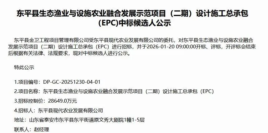 东平县生态渔业与设施农业融合发展示范项目(二期)设计施工总承包(EPC)中标候选人公示