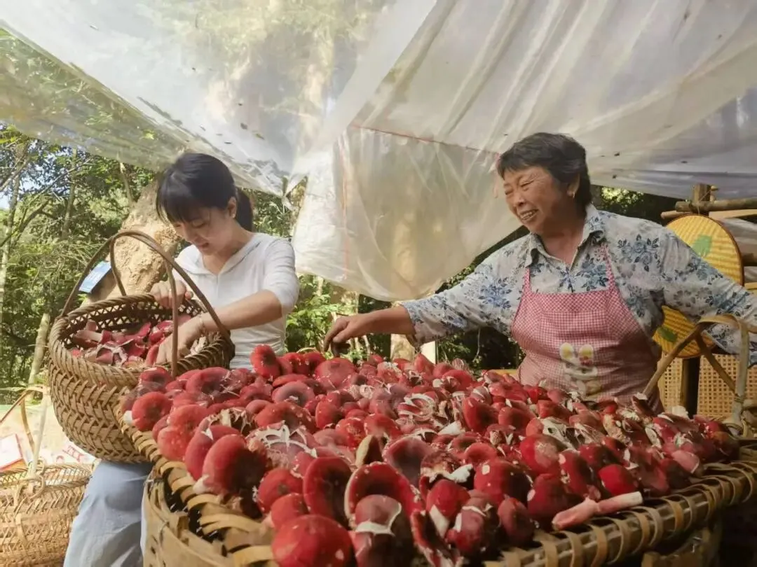 (二)生态“共护”,筑牢产业持续发展之根。一是巡护常态化。建立“县统筹+乡镇监管+合作社落实+农户参与”四级管护体系,组建专业化护林队伍32支,配备无人机、红外相机、智能巡护终端,加强常态化巡护。二是采菇科学化。制定《林下红菇科学采收技术规范》,明确“每年7—9月为集中采收期、菌盖未开伞为采收标准、严禁采摘幼菇”,从源头杜绝“杀鸡取卵”式采摘,保障红菇种群自然繁衍。三是抚育精准化。对阔叶林通过清理林下杂灌和人工补植栲树、米槠、红锥等红菇伴生树种,提升红菇生长的“绿色屏障”。