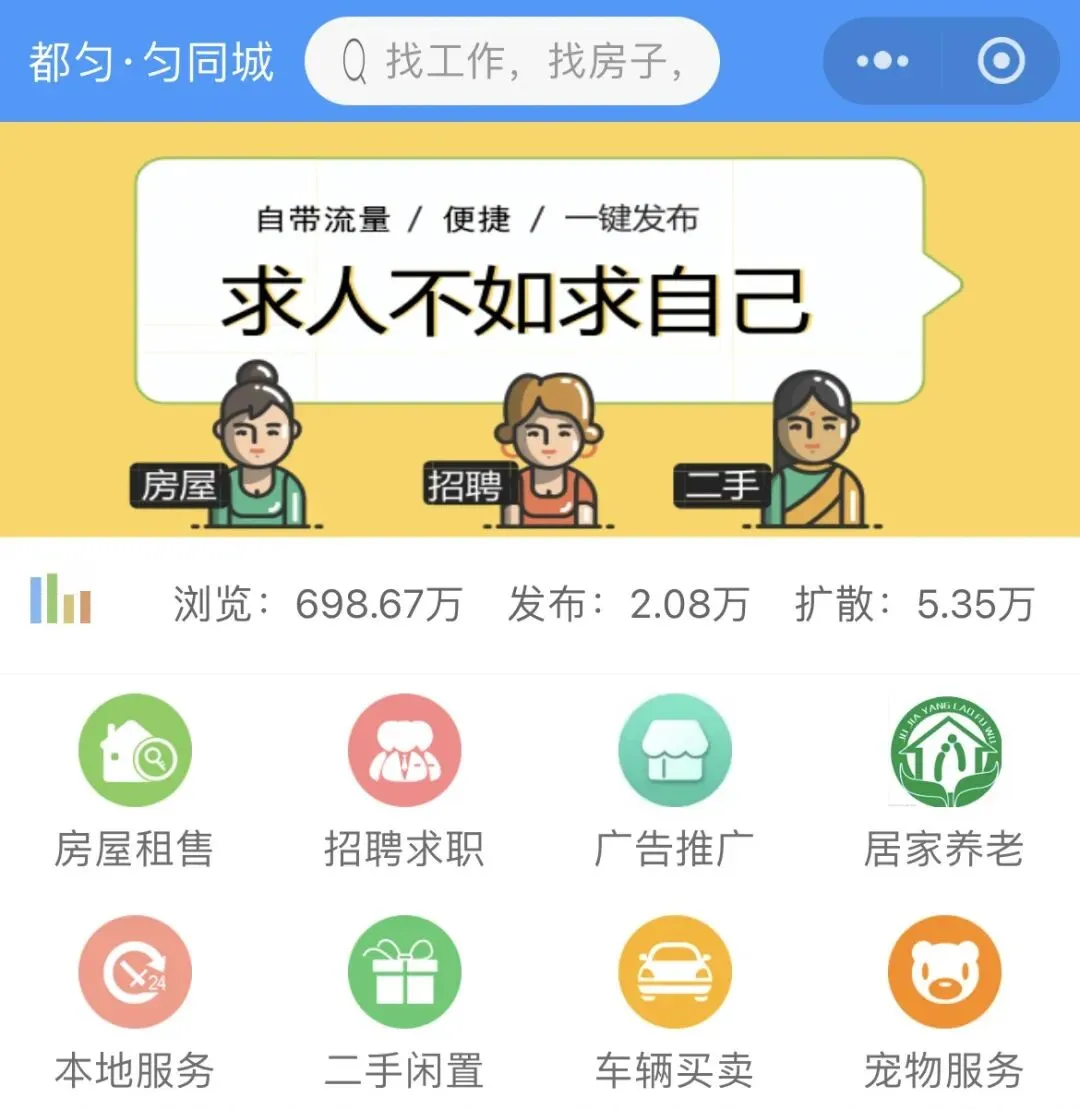 1. 微信搜“匀同城”,关注公众号,小程序。