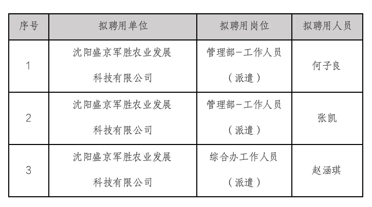根据企业员工招聘有关规定,经过资格审核、面试、考察、体检等程序,确定以下人员为沈阳盛京军胜农业发展科技有限公司及所属企业派遣岗位拟聘人员,现予以公示。公示期间如有问题,请向公司纪检部致电反映。