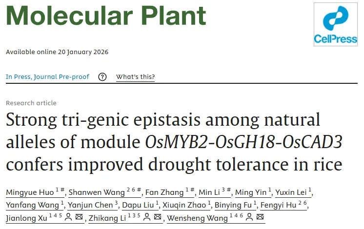1月20日,中国农业科学院王文生教授团队在《Molecular Plant》在线发表了题为“Strong tri-genic epistasis among natural alleles of module OsMYB2-OsGH18-OsCAD3 confers improved drought tolerance in rice”的研究论文,该研究成功克隆并解析了水稻中调控抗旱性的三个关键基因 ——OsMYB2、OsGH18 和 OsCAD3,揭示了这三个基因组成的模块通过自然等位基因间的强三基因上位性互作,增强木质素合成进而提升水稻抗旱性的分子机制,为水稻抗旱育种提供了新的基因资源和理论依据。