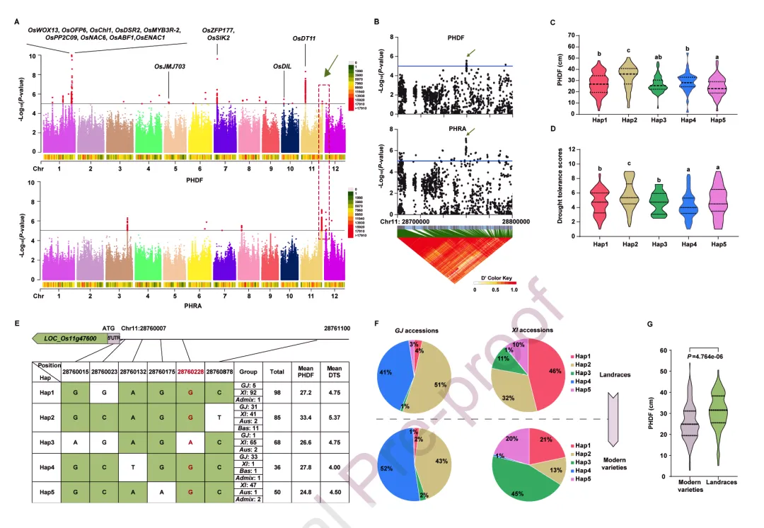 为解决上述问题,研究团队筛选了 408 份材料组成群体,结合 SNP 标记进行群体结构分析,将其划分为籼稻、粳稻、混合群、巴斯马蒂稻和 Aus 稻 5 个类群。通过田间试验测定了这些材料在正常供水和干旱胁迫下的株高,以正常与干旱条件下的株高差值(PHDF)作为抗旱性评价指标,发现不同材料间 PHDF 变异显著,且干旱胁迫、类群间及类群内材料间的变异均达极显著水平,其中籼稻亚群的平均 PHDF 显著低于粳稻亚群,表明籼稻材料整体抗旱性更强。随后,利用全基因组关联分析(GWAS),分别在全群体、籼稻 + Aus 群和粳稻 + Bas 群中鉴定与 PHDF 相关的 QTL,共发现大量显著关联 SNP,分布在 12 条染色体上,其中部分 QTL 在多个群体中被检测到。进一步对关键 QTL 区域进行候选基因筛选,结合水稻功能基因数据库注释,锁定 LOC_Os11g47600 为关键候选基因,该基因编码含 GH18 结构域的糖基水解酶,命名为 OsGH18。