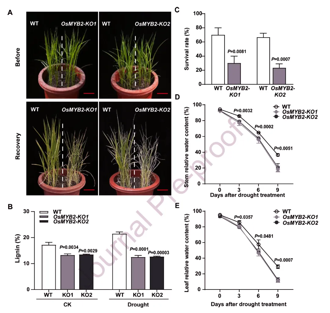 考虑到 OsGH18 启动子区域的单倍型变异与抗旱性相关,研究团队对 OsGH18 启动子的顺式调控元件进行分析,发现其包含多个胁迫响应元件。不同 OsGH18 单倍型的调控元件拷贝数存在差异,且其表达水平与抗旱性表型相关。结合 GWAS 结果,位于特定 QTL 区域的 MYB 转录因子基因 OsMYB2 进入研究视野,该基因启动子区域存在多个 SNP,形成两种主要单倍型,分别与不同抗旱性表型相关,且其表达量与抗旱性呈正相关。亚细胞定位显示 OsMYB2 定位于细胞核,符合转录因子特征;进一步实验证实 OsMYB2 可直接结合 OsGH18 和 OsCAD3 启动子中的 MYB 结合位点,正向调控二者的表达。功能验证显示,OsMYB2-KO 突变体在 PEG 胁迫下的存活率显著低于 WT,田间干旱条件下抗旱性评分更高,茎木质素含量在正常和干旱条件下均显著降低,茎木质部细胞壁变薄,表明 OsMYB2 通过调控 OsGH18 和 OsCAD3 的表达,参与木质素合成和水稻抗旱性调控。