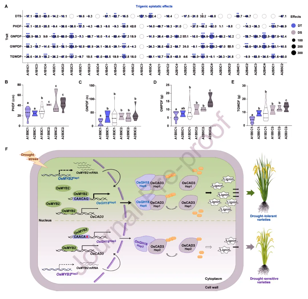 该研究解析了 OsMYB2-OsGH18-OsCAD3 模块的调控机制,明确三者通过转录调控和蛋白互作促进木质素合成,填补了木质素合成与水稻抗旱性关联的研究空白;揭示了三基因自然等位基因间的强上位性效应,建立了基因功能关联与遗传参数的联系,为复杂性状遗传解析提供新范式;开发了基于该模块的抗旱表型预测方法,筛选出优异种质,为水稻抗旱分子育种提供了可直接应用的基因资源和选择标记;同时还提出基于基因功能模块和上位性效应的育种策略,突破传统基因组选择模型局限,为其他复杂性状改良提供重要参考,推动功能基因组学研究成果向育种实践转化。