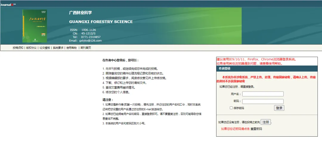 编辑部呼吁广大作者注意甄别信息,我刊主管单位为广西壮族自治区林业局,主办单位为广西壮族自治区林业科学研究院,国际标准连续出版物号:ISSN 1006-1126;国内统一连续出版物号:CN 45-1212/S。  所有官方渠道如下: