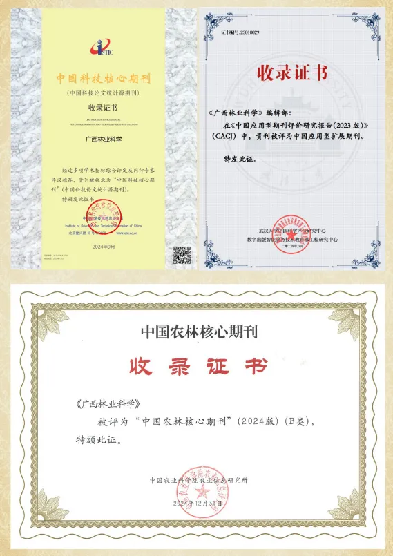 《广西林业科学》(双月刊)创刊于1972年,是由广西壮族自治区林业科学研究院主办的林业学术期刊,主要刊登林业及相关领域具有较高学术水平和应用价值的研究论文、综述等。本刊为“中国科技核心期刊”“中国农林核心期刊(B类)”“RCCSE中国准核心学术期刊(B+)”和“CACJ中国应用型扩展期刊”;是美国《乌利希国际期刊指南》(Ulrichsweb)、日本科学技术振兴机构数据库(JST)、中国知网、万方数据库、维普数据库和超星数字化期刊群等全文收录的期刊;多次被评为“广西优秀科技期刊”。