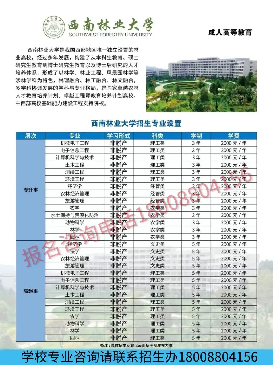 西南林业大学是我国西部地区唯一独立设置的林业本科高校,经过多年发展,构建了从本科生教育、硕士研究生教育到博士研究生教育以及博士后研究的人才培养体系,形成了以林学、林业工程、风景园林、农林经济管理等涉林学科为特色,林理融合、林工融合、林文融合,多学科协调发展的学科与专业格局,是国家卓越农林人才教育培养计划、卓越工程师教育培养计划高校、中西部高校基础能力建设工程支持院校,先后荣获全国绿化先进集体、全国绿化模范单位、全国五四红旗团委、全国大学生暑期实践十佳大学、“国家级公共机构水效领跑者”称号、云南省文明学校、云南省平安校园、省级绿美校园、全省铸牢中华民族共同体意识教育示范学校等多项荣誉称号。