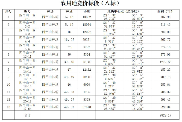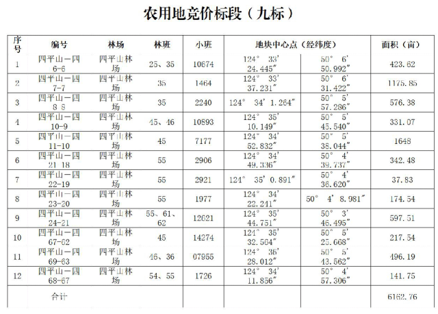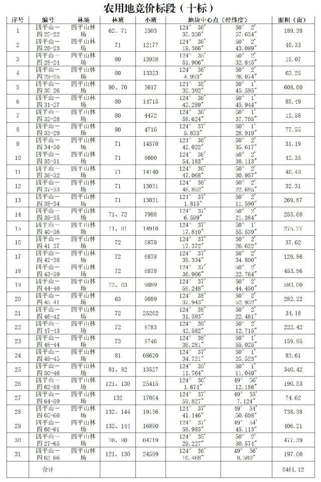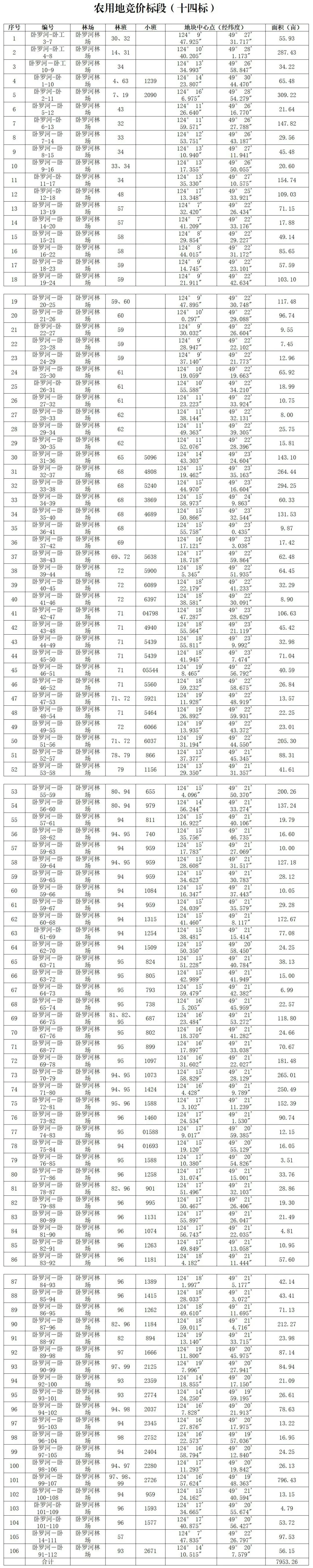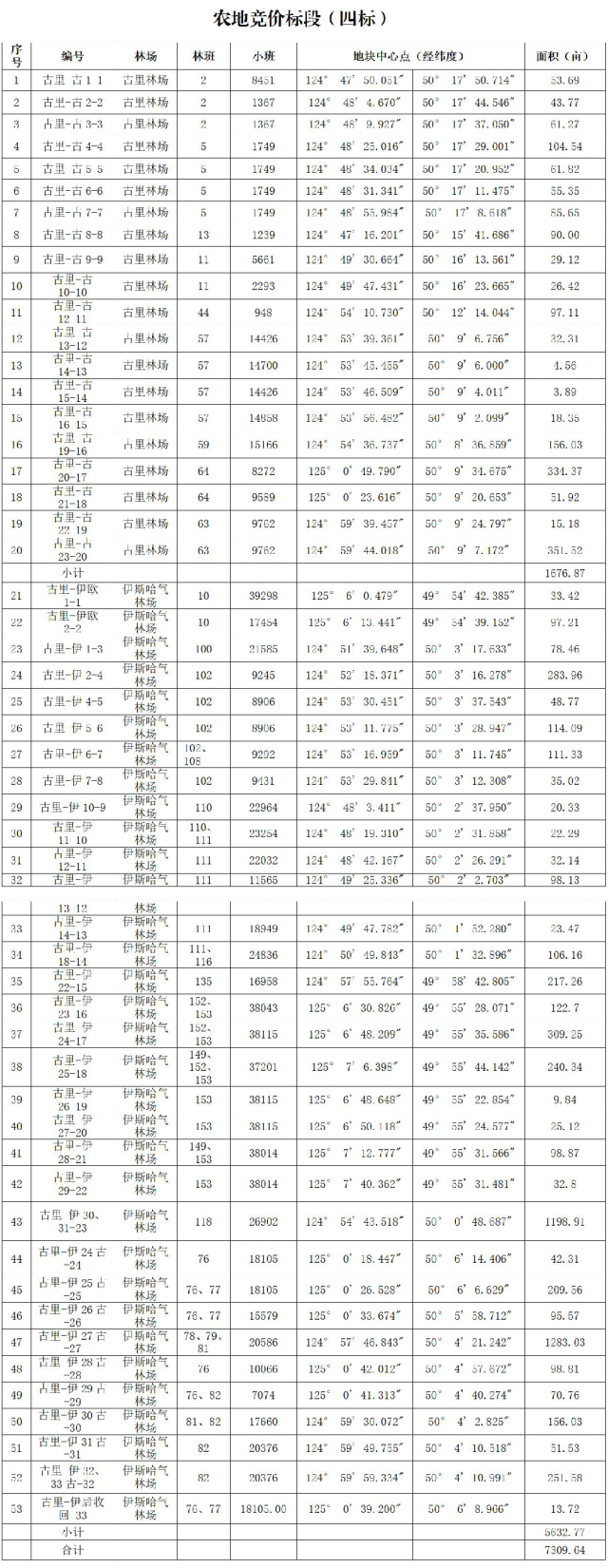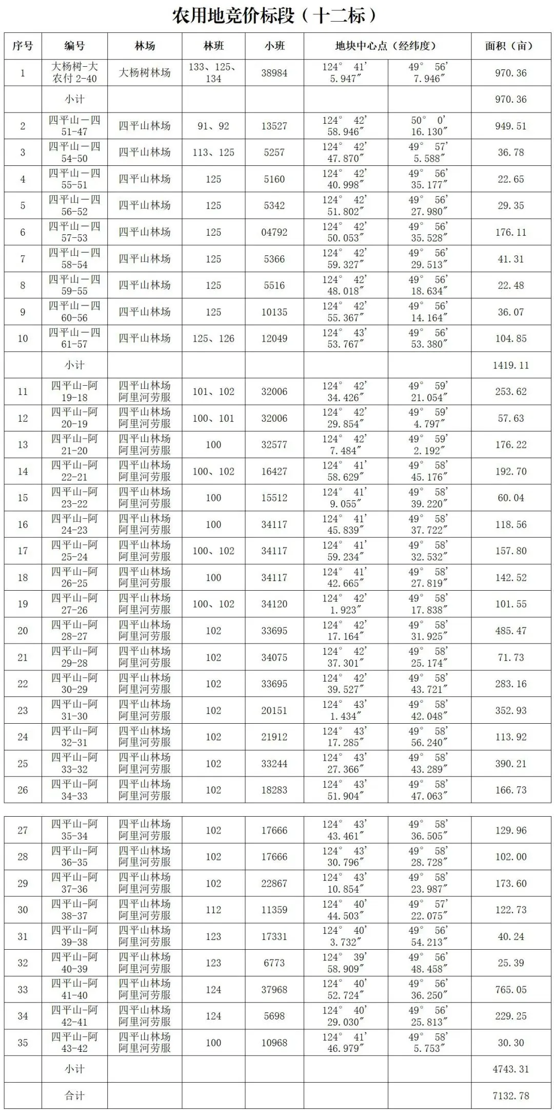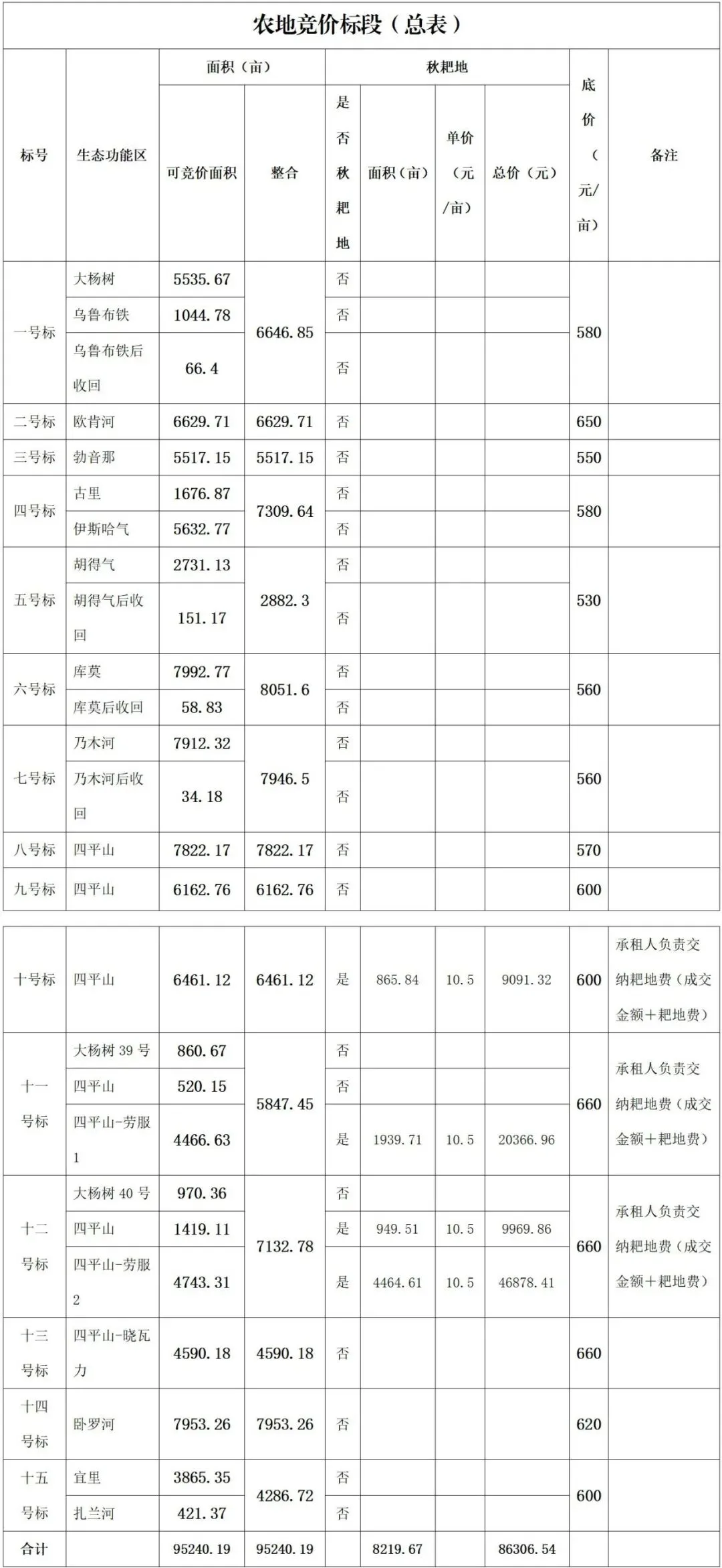 2026年公司委托内蒙古产权交易中心平台,将所属生态功能区内面积95240.19亩林辅农用地进行公开竞价招租(数据来源为森工集团经济开发部整理新林辅农用地台账总数),公司所属生态功能区内林辅农用地均可申报农业土地种植保险。按照公司所属林场施业区将公开竞价标段划分为十五个标段,公告期为7个工作日,自2026年1月21日起,至2026年1月29日止。公开竞价底价、具体地理位置、亩数等信息以公告为准。竞价人需通过平台流程提示参与平台竞价全过程,公开竞价标号情况如下表:
