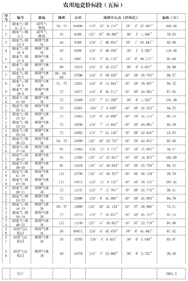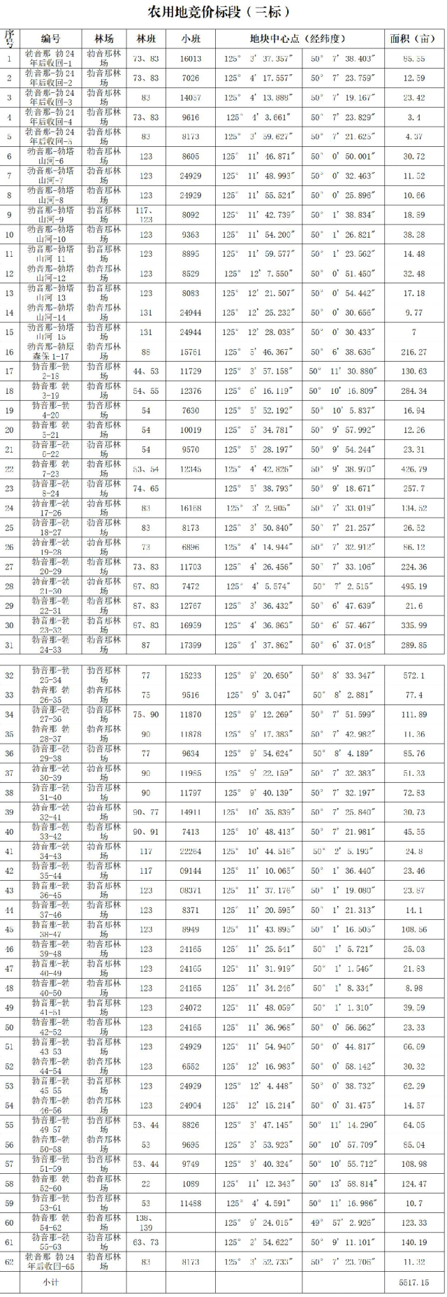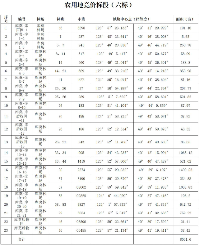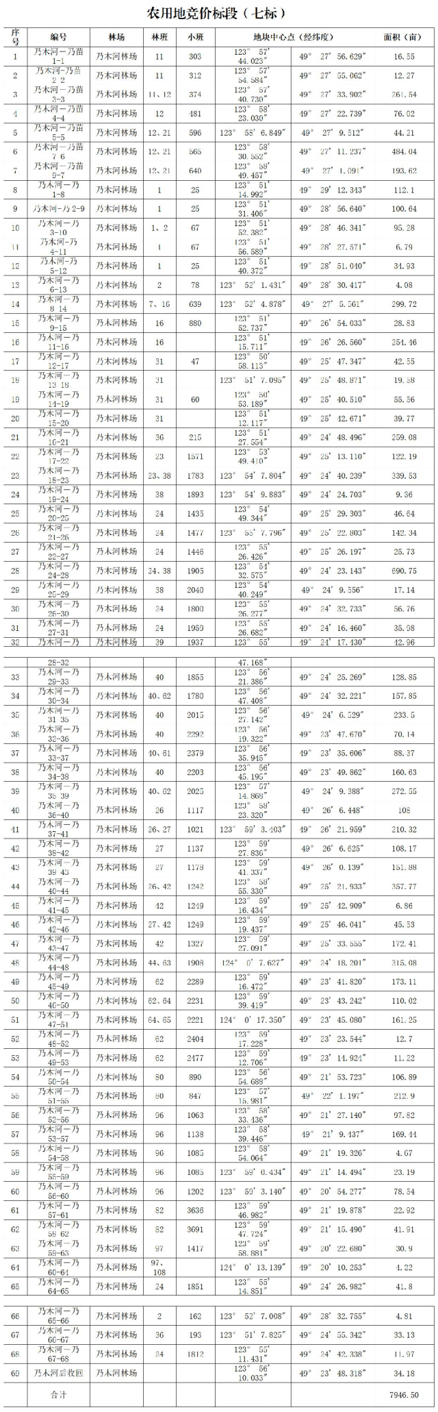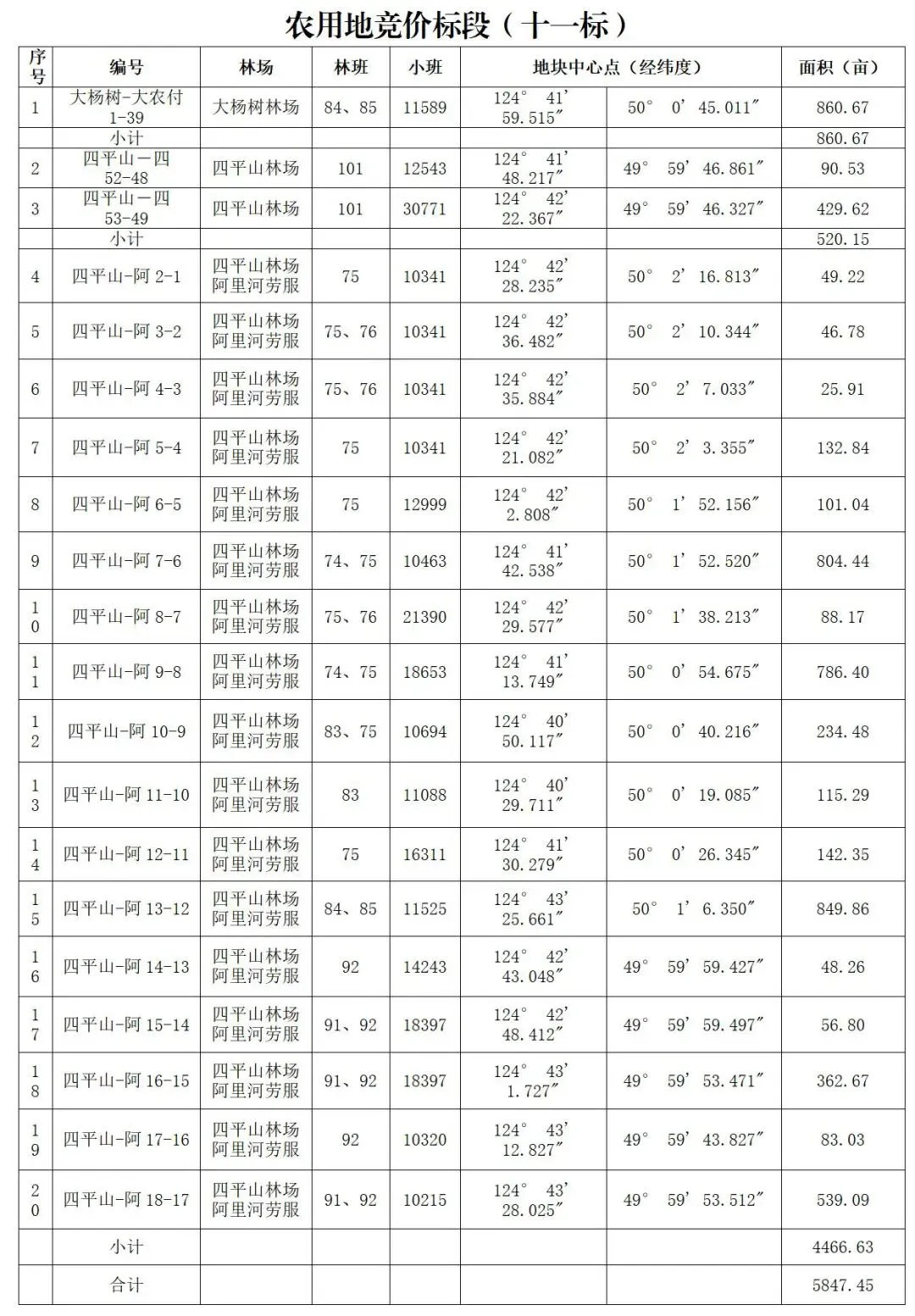 以上十五个标段农用地地块地号、生态功能区、位置(中心点坐标)、林班小班、面积等明细附后。