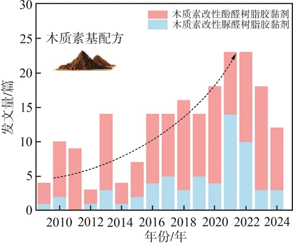 图1 近10年木质素改性酚醛树脂和脲醛树脂胶黏剂的论文发表数量