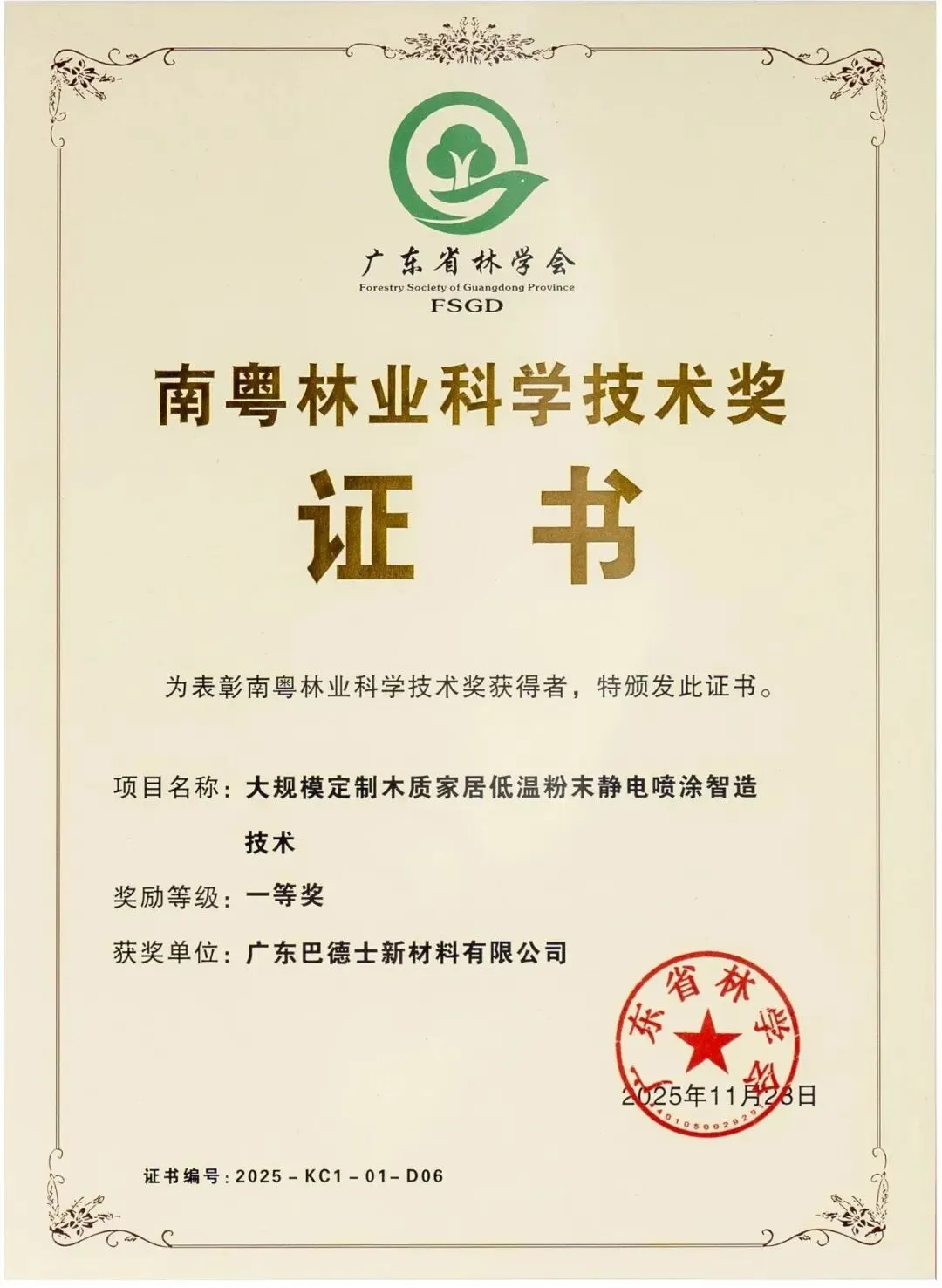 近日,广东省林学会正式公布了第七届南粤林业科学技术奖评选结果。其中,由中国林学会指导、索菲亚家居牵头、巴德士等公司联合完成的《大规模定制木质家居低温粉末静电喷涂智造技术》项目,荣膺科技创新奖一等奖。值得关注的是,巴德士粉末涂料技术总监刘建明也因在该项目中的突出贡献,摘得个人一等奖殊荣。这一奖项不仅是对巴德士研发实力的高度认可,更标志着我国粉末涂料技术在木质家居等热敏基材领域的重大突破,为涂料行业的绿色转型树立了新标杆。