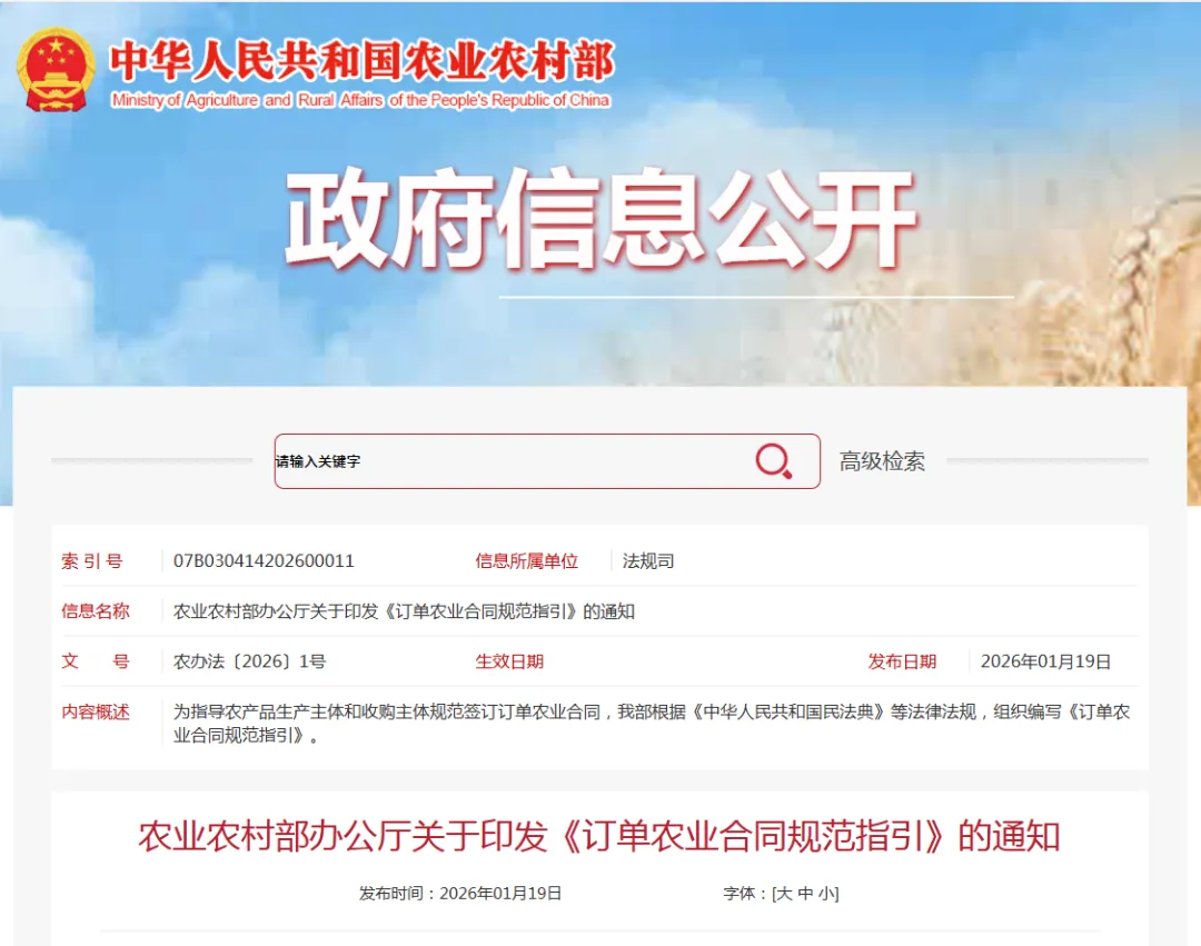 为指导农产品生产主体和收购主体规范签订订单农业合同,我部根据《中华人民共和国民法典》等法律法规,组织编写了《订单农业合同规范指引》(以下简称《指引》),现印发给你们。《指引》是依据相关法律规定对订单农业合同签订提供的行政指导。各地要加大《指引》宣传推广,积极指导有签订订单农业合同意向的农产品生产主体和收购主体,参照《指引》在平等自愿、协商一致的基础上依法订立合同、确定双方权利义务。要结合本地区产业发展实际,参照《指引》探索分领域发布订单农业合同示范文本,提高订单农业合同履约率,保障合同双方合法权益。要加强检验检测、涉农企业生产经营资质核查等服务,引导合同双方通过正规渠道选购农资、科学规范从事种植养殖。