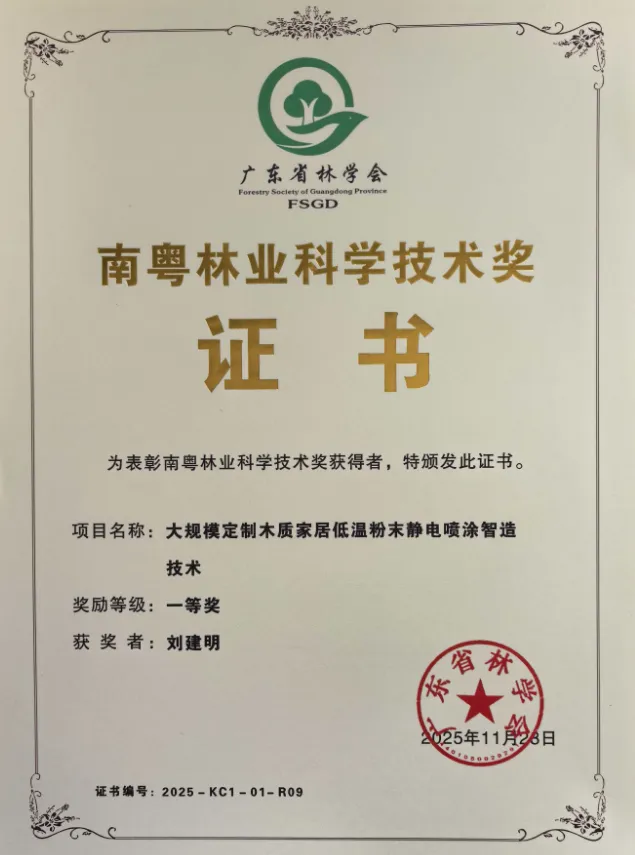 南粤林业科学技术奖,旨在深入践行“绿水青山就是金山银山”理念。该项目突破传统粉末涂料因高温固化无法应用于木质家居、且易黄变的技术瓶颈,研制了木质家居低温固化耐黄变粉末涂料,实现从材料到工艺、从定制化生产到规模化制造的全链条突破,推动家居产业向环保化、智能化转型升级。