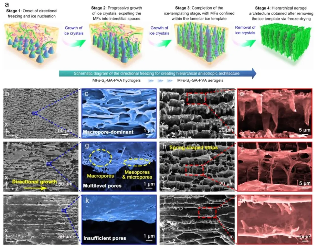 图 1 不同木材细胞壁位置解离的木材微纤维(MFs)的制备策略、形貌及化学成分。(a) S₂亚层木材微纤维(MFs-S₂)和中层木材微纤维(MFs-ML)的解离示意图。(b−g) 三种木材微纤维的扫描电子显微镜(SEM)图像:(b, c) 中层木材微纤维(MFs-ML);(d, e) S₂亚层木材微纤维(MFs-S₂);(f, g) 随机层木材微纤维(MFs-RL)。(h−j) 三种木材微纤维的纤维素 / 木质素分布(以 I₂₉₀₀/I₁₅₉₉比值表示):(h) 中层木材微纤维(MFs-ML);(i) S₂亚层木材微纤维(MFs-S₂);(j) 随机层木材微纤维(MFs-RL)。(k) 共聚焦拉曼光谱。(l) 纤维素 / 木质素强度对比图。(m) X 射线衍射(XRD)图谱。图 2 S₂亚层木材微纤维(MFs-S₂)与聚乙烯醇(PVA)的 3D 交联。(a) 以戊二醛(GA)为交联剂的 S₂亚层木材微纤维(MFs-S₂)与聚乙烯醇(PVA)的交联示意图,展示了推测的物理和化学键合类型。(b) 傅里叶变换红外(FTIR)光谱、(c) X 射线衍射(XRD)图谱、(d−g) S₂亚层木材微纤维(MFs-S₂)与聚乙烯醇(PVA)交联前后的 C 1s 和 O 1s X 射线光电子能谱(XPS)。(h) 热重(TG)曲线和 (i) 微分热重(DTG)曲线。图 3 S₂亚层木材微纤维 - 戊二醛 - 聚乙烯醇(MFs-S₂−GA−PVA)气凝胶的层级有序结构。(a) 用于构建层级各向异性结构的定向冷冻示意图。(b−e) MFs-S₂−GA−PVA-1 气凝胶的扫描电子显微镜(SEM)图像:(b−c) 侧视图(X−Z 平面),展示多层级孔隙;(d−e) 正视图(Y−Z 平面),呈现各向异性平行层状微通道。(f−i) MFs-S₂−GA−PVA-3 气凝胶的 SEM 图像:(f−g) 侧视图和 (h−i) 正视图。(j−m) MFs-S₂−GA−PVA-5 气凝胶的 SEM 图像:(j−k) 侧视图和 (l−m) 正视图图 4 S₂亚层木材微纤维 - 戊二醛 - 聚乙烯醇(MFs-S₂−GA−PVA)气凝胶沿 Y 方向压缩时的柔韧性与超弹性。(a) 厘米 / 分米尺度的 MFs-S₂−GA−PVA-3 气凝胶。(b) 多种形状的 MFs-S₂−GA−PVA-3 气凝胶。(c) 一块轻质 MFs-S₂−GA−PVA-3 气凝胶平衡在蒲公英种子绒毛尖端。(d) MFs-S₂−GA−PVA-3 气凝胶在压缩前、压缩过程中及压缩后的状态。(e) 不同气凝胶在 50% 最大应变下的压缩应力 - 应变曲线。(f) MFs-S₂−GA−PVA-3 气凝胶在加载 - 卸载循环过程中的压缩应力 - 应变曲线。(g) MFs-S₂−GA−PVA-3 气凝胶在 50% 最大应变下的 1000 次循环疲劳测试。(h) MFs-S₂−GA−PVA-3 气凝胶在不同循环次数下的杨氏模量、最大应力及能量损失系数 ΔU/U。(i) MFs-S₂−GA−PVA-3 气凝胶的超弹性机理示意图。图 5 S₂亚层木材微纤维 - 戊二醛 - 聚乙烯醇(MFs-S₂−GA−PVA)气凝胶的孔隙结构与吸声性能。(a) 氮气吸附 - 脱附等温线。(b) 微孔和介孔尺寸分布。(c) 汞侵入累积曲线。(d−f) 不同厚度的 MFs-S₂−GA−PVA 气凝胶沿 Z 方向(平行于层状结构)测量的吸声系数(SAC)和 (g) 噪声降低系数(NRC)。(h) 吸声性能对比图。(i) 不同极端温度下 MFs-S₂−GA−PVA-3 气凝胶的吸声系数(SAC)。(j−o) MFs-S₂−GA−PVA-3 气凝胶作为吸声墙体材料的应用:(j−l) 模型房屋场景;(m−o) 模型水下航行器场景。图 6 气凝胶的 JCA 模型分析与吸声机理。(a) 30mm 厚度气凝胶的吸声系数(SAC)曲线(实验值与 JCA 模型预测值)。(b−d) (b) 密度 ρ、(c) 体积模量 K 和 (d) 声阻抗 Zₛ的实部与虚部图谱。(e) 比声阻抗 Zₛ/ρ₀c₀的相量图。(f) 沿 Z 方向测量的 “梯度孔循环(GPC)” 吸声机理示意图。图 7 S₂亚层木材微纤维 - 戊二醛 - 聚乙烯醇(MFs-S₂−GA−PVA)气凝胶的宏微结合模拟分析与吸声机理。(a) MFs-S₂−GA−PVA-3 气凝胶的宏微结合模型(长结构采用 “螺旋式” 表征)。(b) 基于区域分解的异步时间步并行超级计算策略。(c−e) 20mm 厚度气凝胶的吸声系数(SAC)曲线(实验值与模拟预测值)。(f−h) 绝对声压的模拟分布。(i−k) 阐释 MFs-S₂−GA−PVA-1、-3、-5 三种气凝胶吸声机理的示意图。原文链接:https://pubs.acs.org/doi/10.1021/acsnano.5c06002