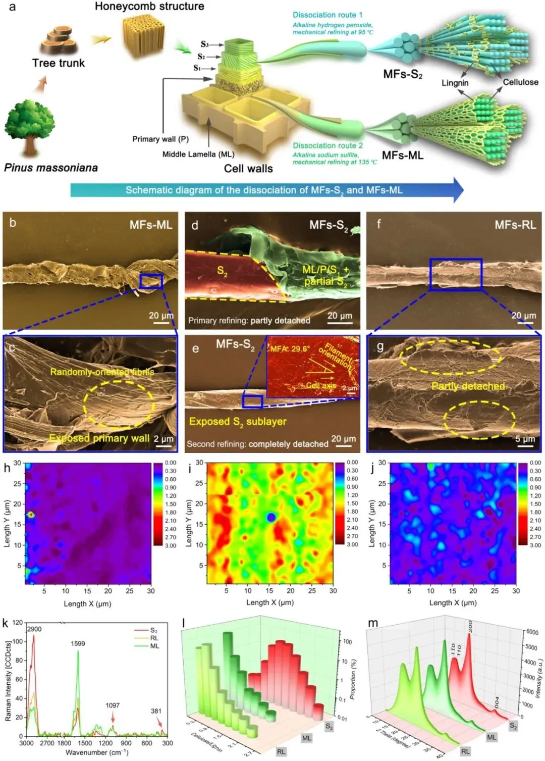 图1 | 从不同木质细胞壁位置分离出的微纤维的制备策略、形态和化学成分。(a)MFs-S2和MFs-ML分离的示意图。(b - g)三种类型木质微纤维的SEM图像:(b,c)MFs-ML;(d,e)MFs-S2;以及(f,g)MFs-RL。(h - j)三种类型微纤维的纤维素/木质素分布(I2900/I1599):(h)MFs-ML;(i)MFs-S2;以及(j)MFs-RL。(k)共聚焦拉曼光谱。(l)纤维素/木质素强度的比较。(m)XRD图谱。