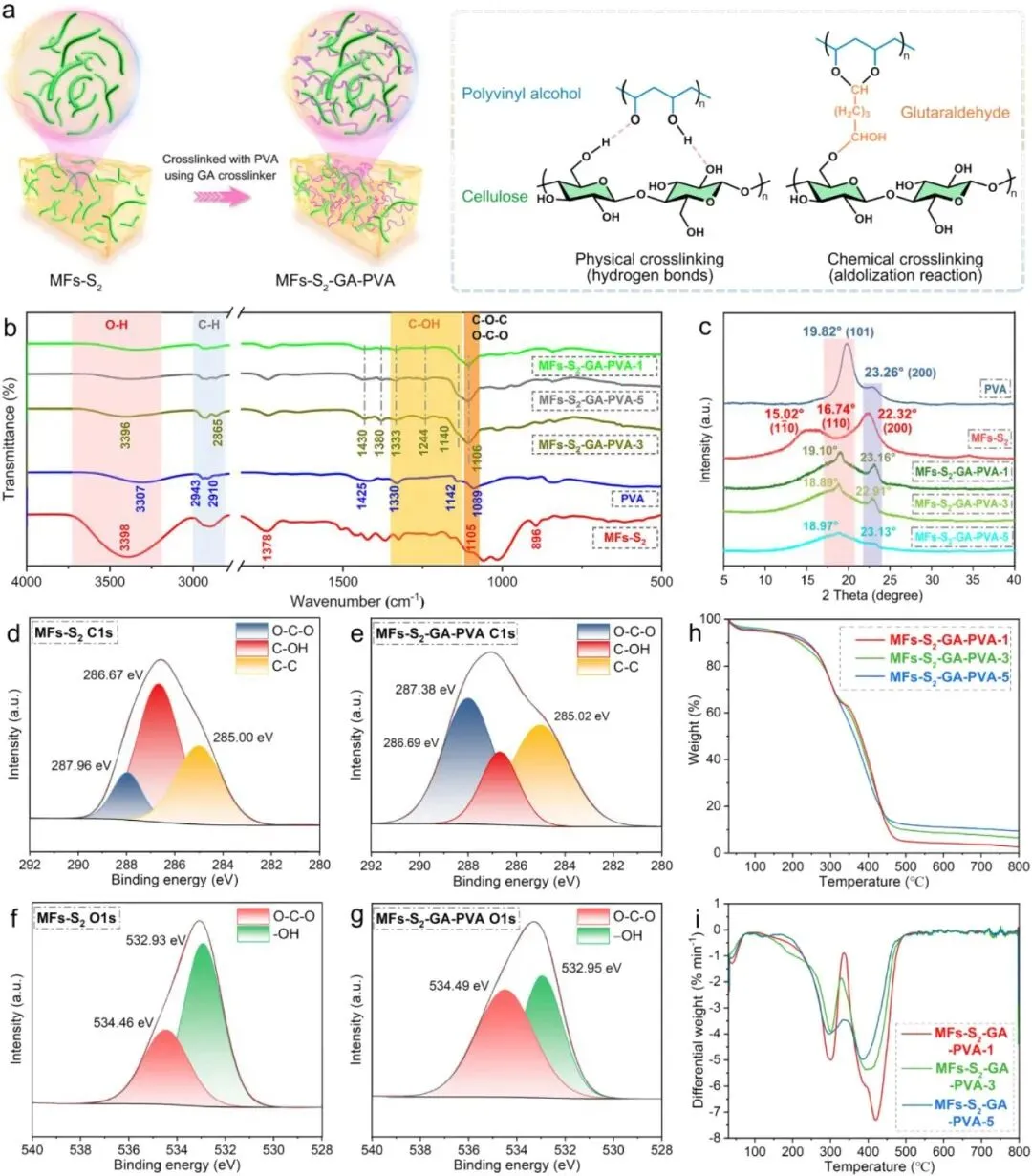 图2 | 将木质纤维素微团块(MFs-S2)与聚乙烯醇(PVA)进行三维交联。(a)使用甘油酸(GA)作为交联剂对木质纤维素微团块(MFs-S2)和聚乙烯醇进行交联的示意图,展示了所提出的物理和化学连接类型。(b)傅里叶变换红外光谱(FTIR)图谱,(c)X射线衍射(XRD)图谱,以及(d - g)木质纤维素微团块(MFs-S2)在与聚乙烯醇交联前后的C 1s和O 1s XPS光谱。(h)热重曲线和(i)差热重曲线。