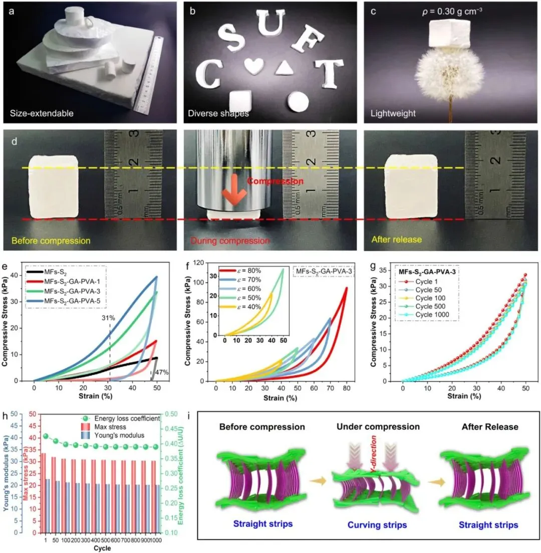 图4 | MFs-S2−GA−PVA气凝胶在沿Y方向压缩时具有良好的柔韧性和超弹性特性。(a)厘米/分米尺度下的MFs-S2−GA−PVA-3气凝胶。(b)形状各异的MFs-S2−GA−PVA-3气凝胶。(c)在蒲公英种子绒毛尖端平衡着的轻质MFs-S2−GA−PVA-3气凝胶。(d)压缩前、压缩中和压缩后的MFs-S2−GA−PVA-3气凝胶。(e)在最大应变 50%时不同气凝胶的压缩应力-应变曲线。(f)在不同最大应变下进行加载-卸载循环时的MFs-S2−GA−PVA-3气凝胶的压缩应力-应变曲线。(g)在 50%最大应变下对MFs-S2−GA−PVA-3气凝胶进行的1000次循环疲劳测试。(h)MFs-S2−GA−PVA-3气凝胶在不同循环次数下的杨氏模量、最大应力和能量损失系数ΔU/U。(i)MFs-S2−GA−PVA-3气凝胶超弹性机制的示意图。