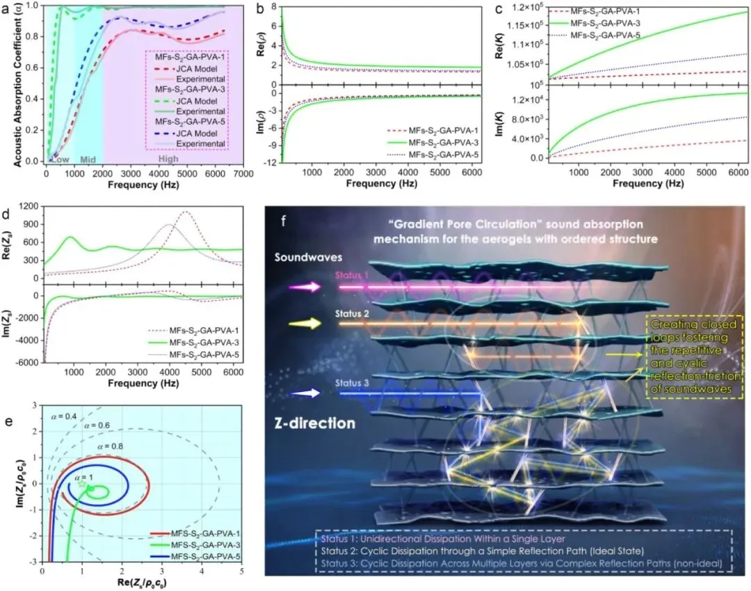 图6 | 气凝胶的JCA模型分析及吸声机制。(a)厚度为30毫米时的SAC曲线(实验数据和JCA模型预测值)。(b - d)密度 ρ、(c)体积模量K和(d)声阻抗Zs的实部和虚部图。(e)特定声阻抗Zs/ρ0c0的相位图。(f)沿 Z 方向测量的“梯度孔隙循环”吸声机制的示意图。