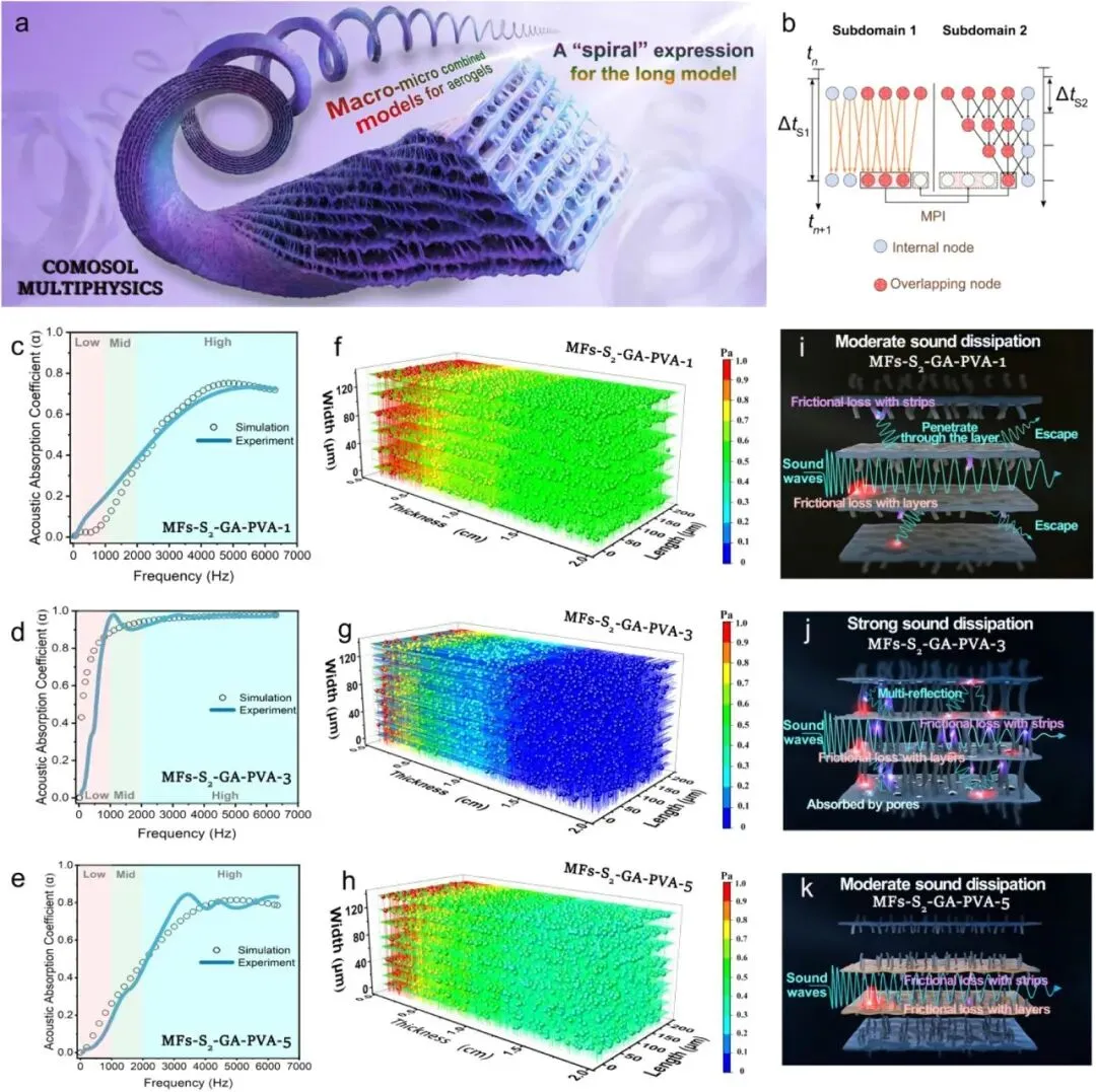 图7 | 宏-微相结合的模拟分析及MFs-S2-GA-PVA气凝胶的吸声机制。(a)MFs-S2-GA-PVA-3气凝胶的宏-微相结合模型(采用长结构的“螺旋”表示方式)。(b)基于域分解和异步时间步进的并行超级计算策略。(c - e)厚度为20毫米时的SAC曲线(实验和模拟预测)。(f - h)绝对声压的模拟分布。(i - k)说明MFs-S2-GA-PVA-1、-3和-5气凝胶吸声机制的示意图。