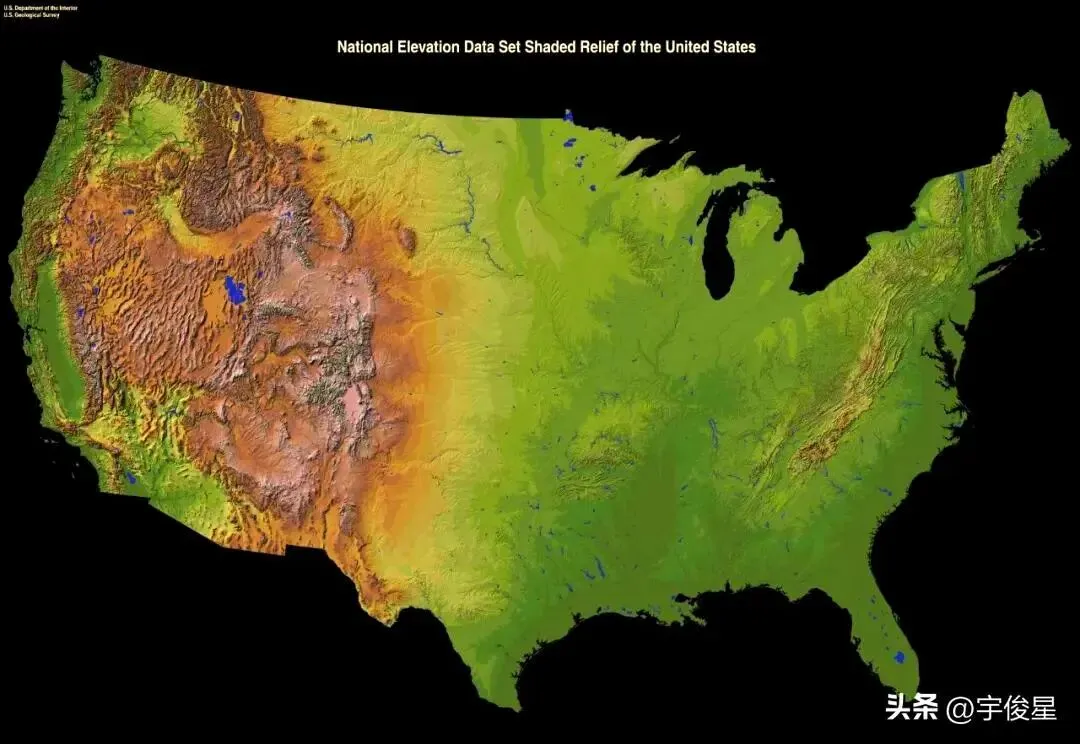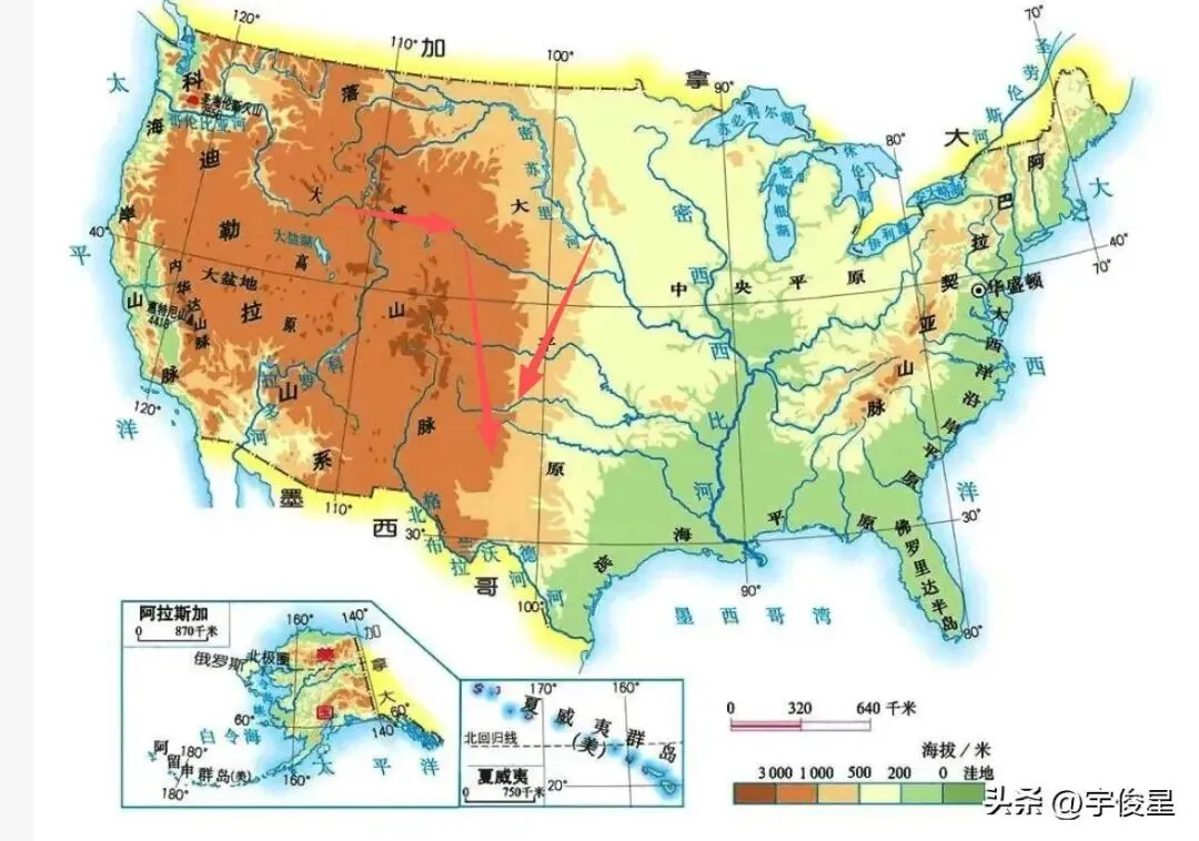 美国的地势,大部分缺水的地区在海拔较高处