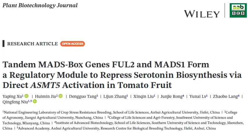 近日,来自安徽农业大学的牛庆丰教授研究团队,联合南方科技大学郎曌博教授团队等单位在植物学国际顶级期刊《Plant Biotechnology Journal 》在线发表了题为:Tandem MADS-Box Genes FUL2 and MADS1 Forma Regulatory Module to Repress Serotonin Biosynthesis viaDirect ASMT5 Activation in Tomato Fruit 的研究论文。