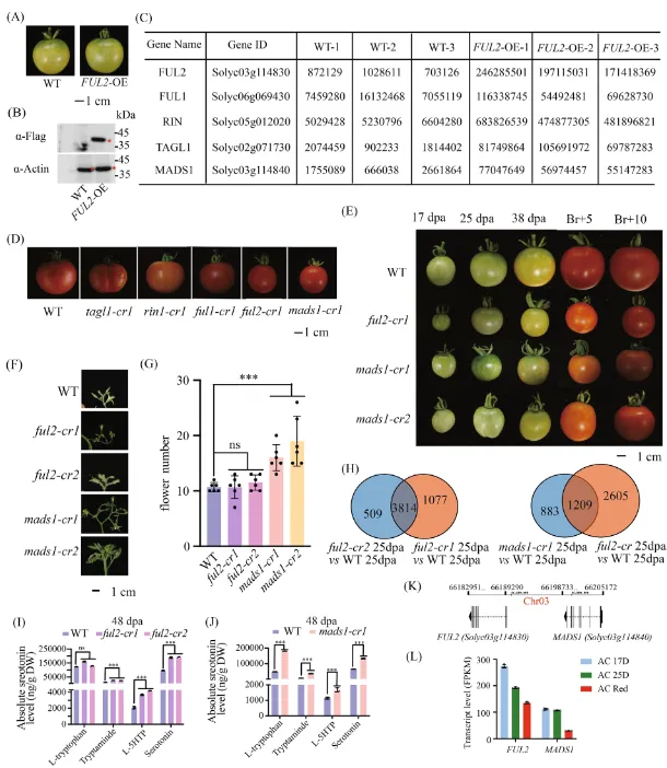 作物育种层面:提供了改良作物血清素含量的分子靶点,可通过编辑 FUL2、MADS1 基因或其靶基因 ASMT5、TDC1,定向培育高血清素(提升营养价值)或低血清素(优化果实品质)的作物品种;基础研究层面:揭示了发育转录因子调控次生代谢的新型模式,为解析其他作物中类似的 “发育-代谢” 整合机制提供了参考框架;同时明确了 MADS-box 基因家族成员的功能分化,为深入研究该家族基因的进化与功能特异性奠定了基础。