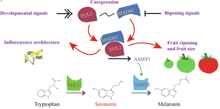 果实成熟是受复杂转录网络调控的生物学过程,MADS-box转录因子发挥关键作用。番茄中,RIN、FUL1和FUL2构成的MADS-box蛋白层级调控乙烯合成、色素积累及质地变化,三者功能缺失突变体果实成熟严重受阻,而FUL2具多效性,还影响开花时间、坐果及果实大小,FUL类基因功能在跨物种中保守,如黄瓜CsFUL1调控果实伸长。血清素作为色氨酸衍生吲哚胺,在番茄果实发育中积累,兼具植物防御与人类膳食益处,其合成与褪黑素通路相关,TDC、ASMT等为关键酶,但成熟转录因子对其代谢的调控尚不明确。