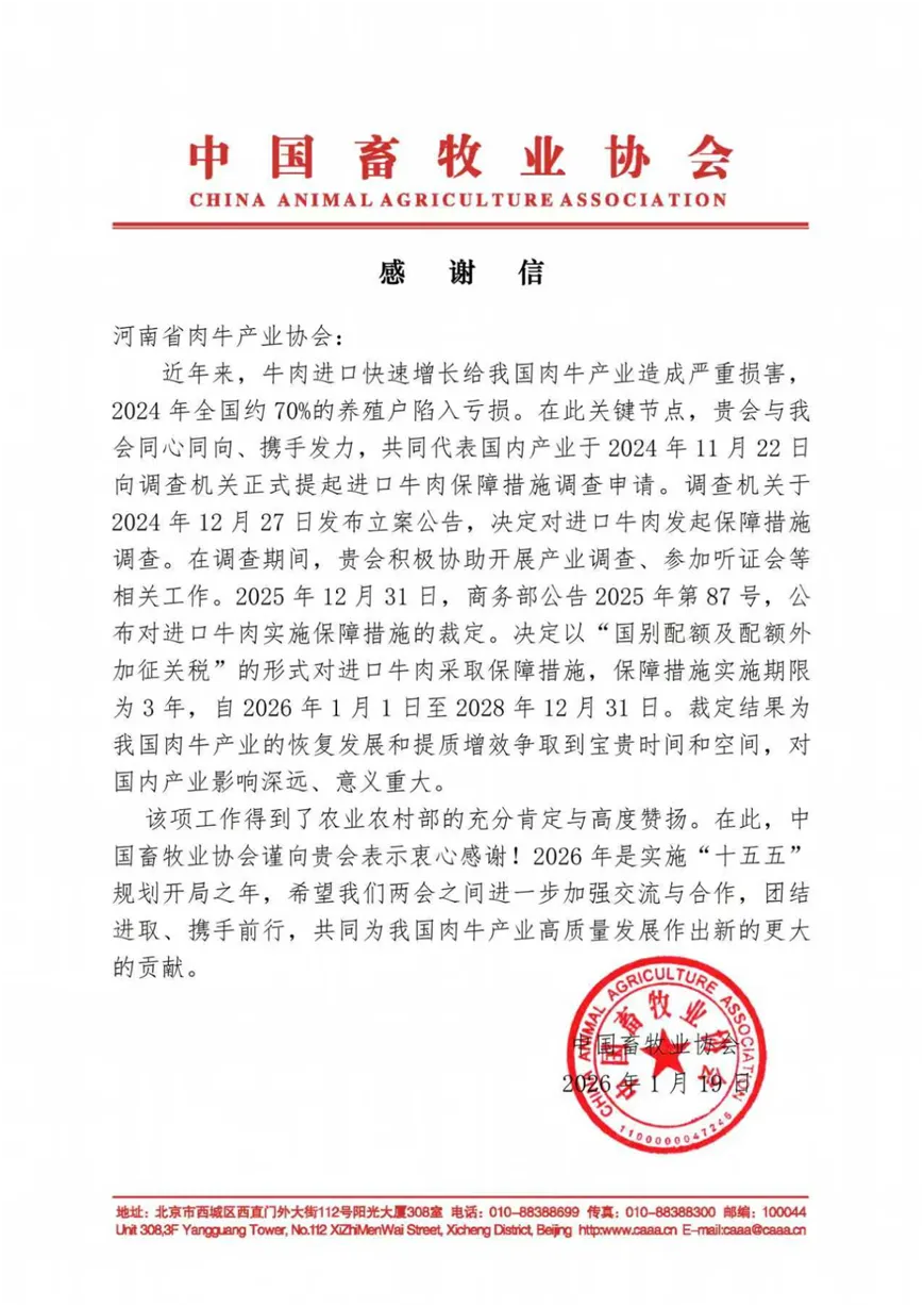 近日,中国畜牧业协会向河南省肉牛产业协会发来感谢信,对河南省肉牛产业协会在进口肉牛保障措施工作中作出的贡献给予充分肯定,并得到了农业农村部的高度赞扬!