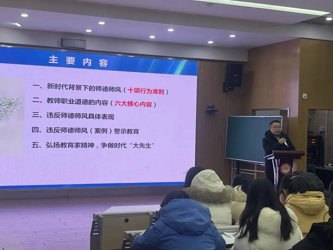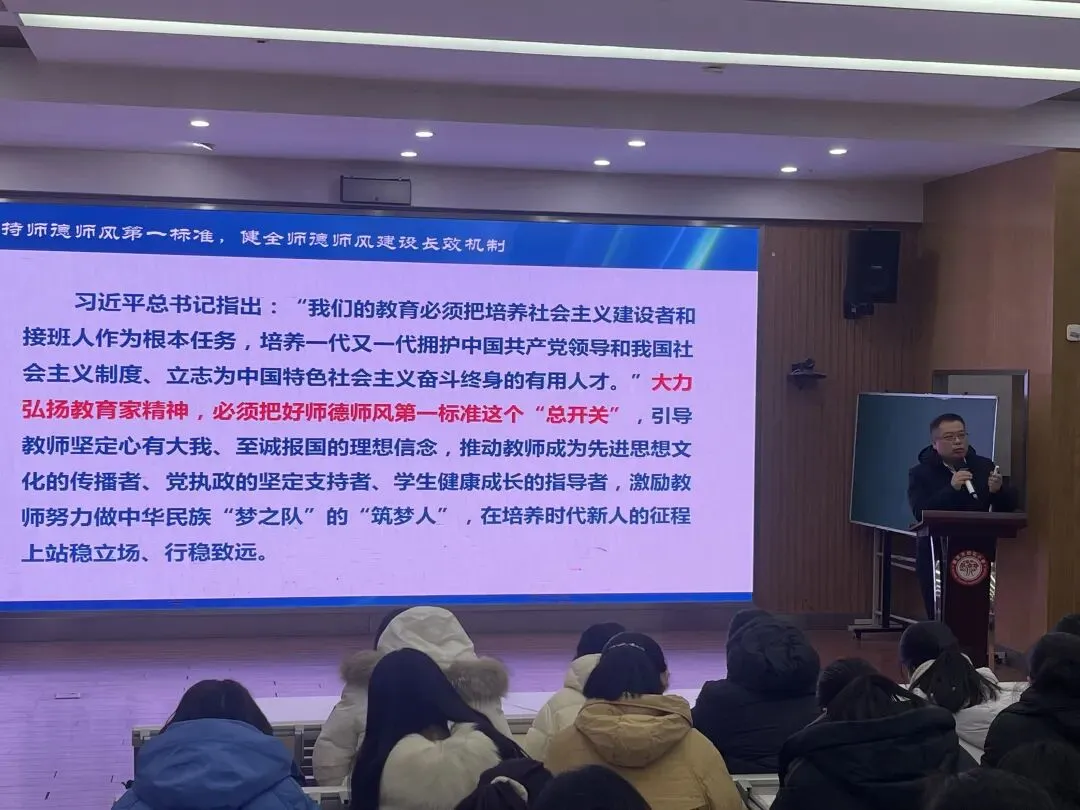 蒋雪松书记以《新时代中小学教师职业行为十项准则》为主线,逐条阐释了坚定政治方向、自觉爱国守法、传播优秀文化、潜心教书育人、关心爱护学生、加强安全防范、坚持言行雅正、秉持公平诚信、坚守廉洁自律、规范从教行为等十个方面的具体内涵与实践要求。他指出,教师不仅是知识的传递者,更是学生成长的引路人和价值观的塑造者,必须做到“言为士则、行为世范”。